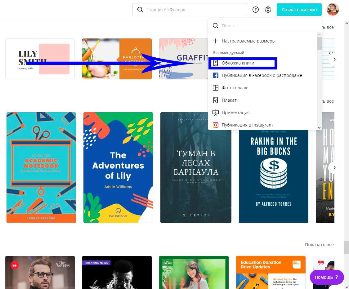 Жмем на "Создать дизайн". Выбираем "Обложка книги".