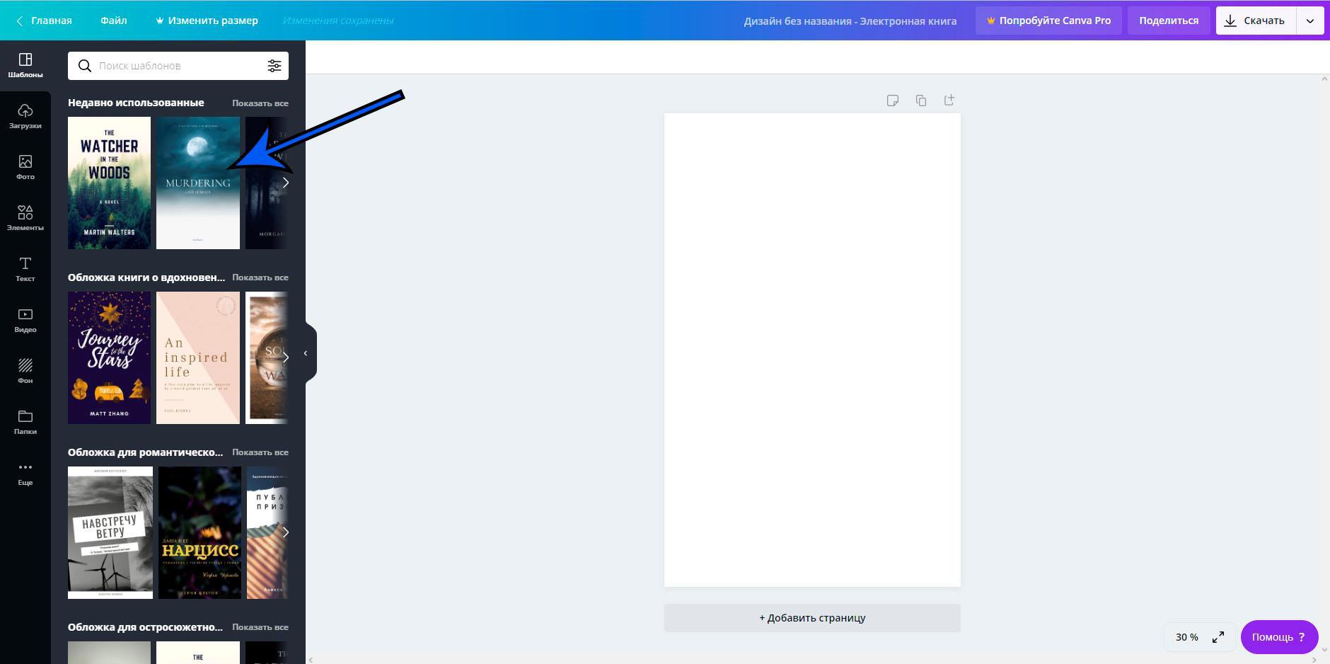 Автоматически программа отправляет в "Шаблоны" (где показаны предлагаемые обложки). Нажав на любую категорию (например, "остросюжетный роман"), получаем варианты обложек для этого жанра.