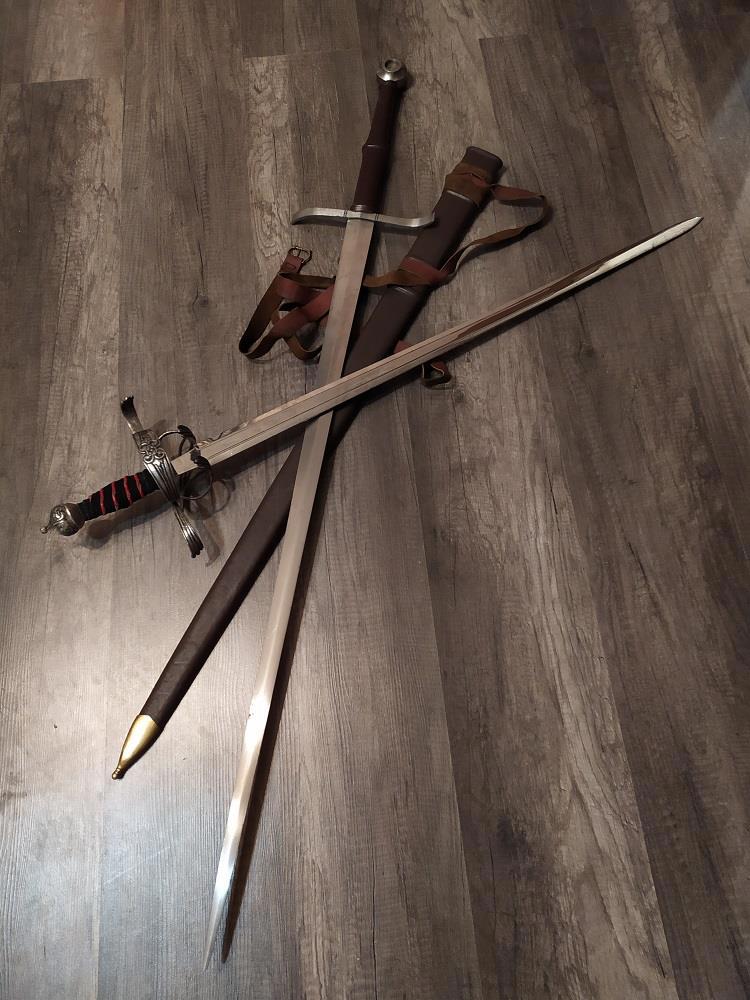 Лонгсворд при большей длине легче, уже и лучше сбаллансирован (это легко объясняется тем, что применяется он для скоростного маневренного боя, а кавалерийский - это суровая военная хреновина, чтоб рубить и колоть со всей рейтарской ненавистью). Он ощущается почти игрушечным, несмотря на то, что габариты и вес практически идентичны оригиналам. Кавалерийский меч требует сильной руки, но все равно он не позволит ударить столь же быстро, как лонгсвордом. Разная сфера применения. Лично мне больше нравится лонгсворд, но я понимаю, что в реалиях начала 17 века он уже морально и физически устарел. Если же сравнивать его с мечом 13 века, например тип Xа или XI (боевого у меня такого нет, тренировочный не особо красив, а искать фоточки в интернете мне лень), то, на мой взгляд, он (логсворд) совершеннее и удобнее. По крайней мере мне с ним комфортнее и возможностей у него, на мой взгляд, больше.