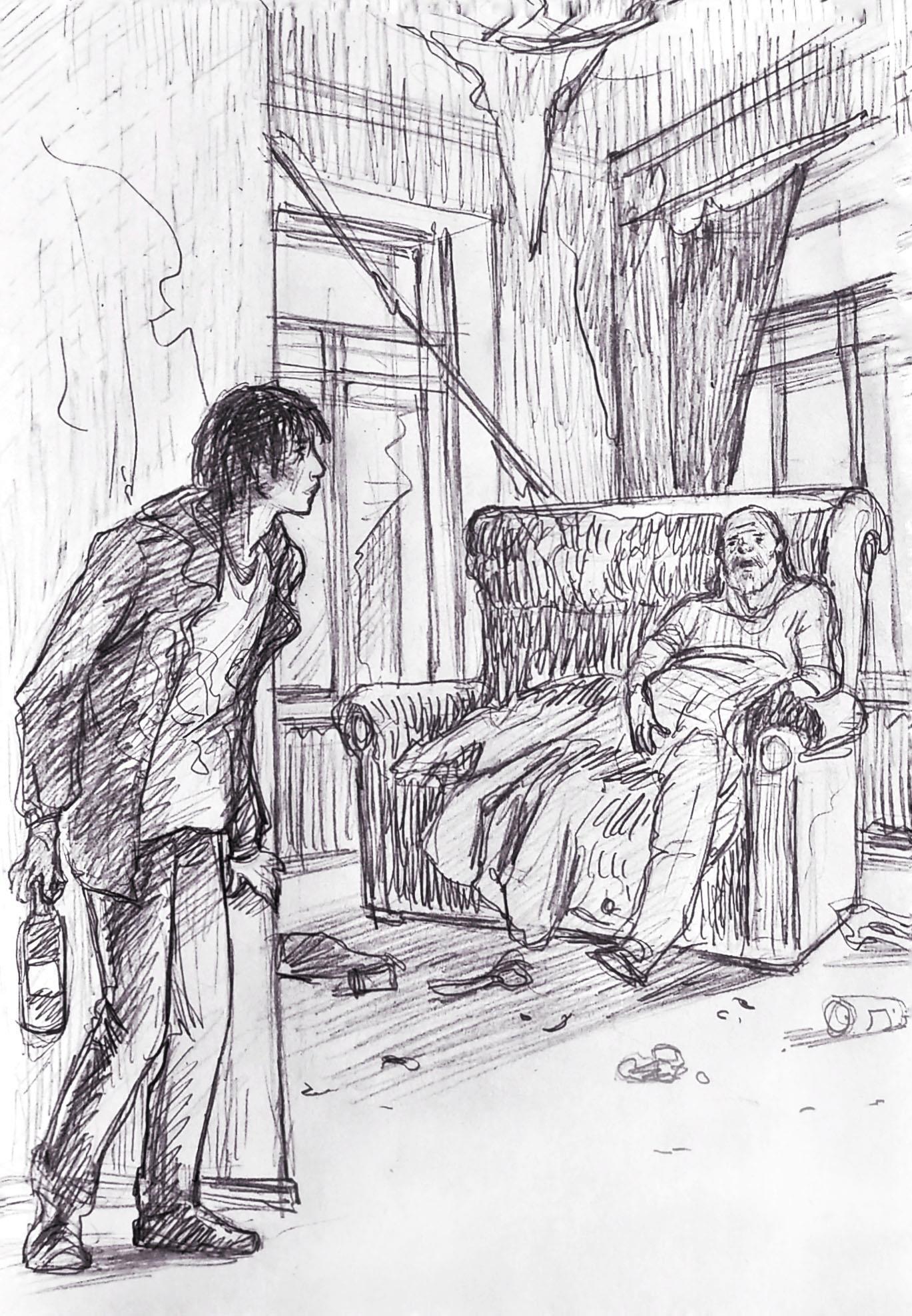 3. Антон Архангельский, «Исходная точка», сцена на выбор рисующего (дабы не рыскать по тексту, можно взять что-то из 3/4/5 главы)