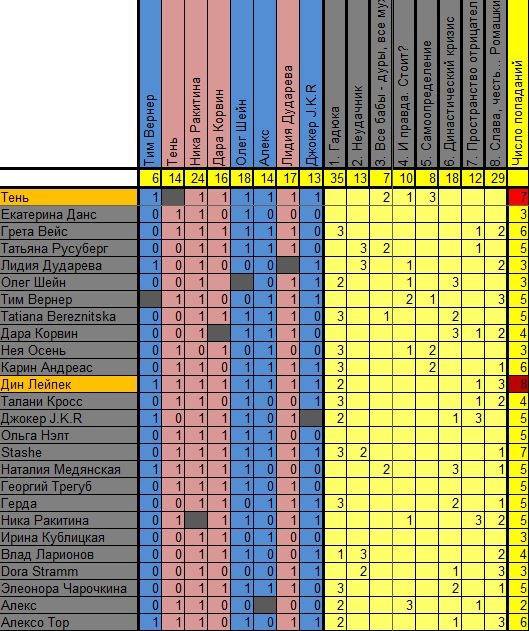 На втором месте – Джокер (13), и только на третьем появляется первая дама, наша блистательная Тень, но и это место она разделила с Алексом… (14).