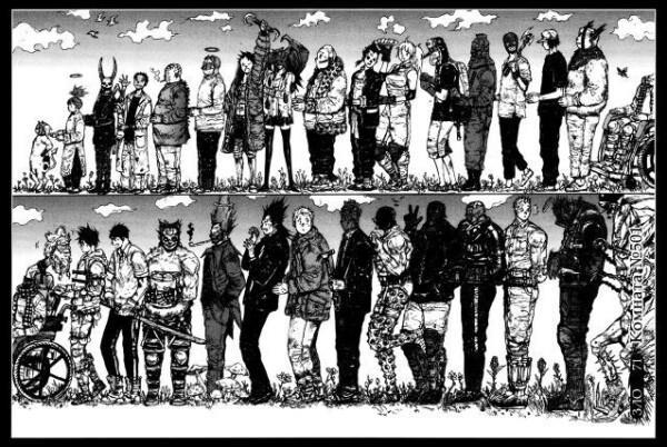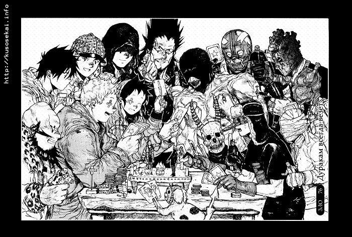 Третье – Персонажи. Две (а в ходе сюжета и три) противоборствующее стороны, ни одну из которых язык не поворачивается назвать антагонистами, ну, только если очень постараться. Каждый, даже самый третьестепенный персонаж потрясающе выписан (и нарисован), имеет характер, мотивы, порой очень странное чувство юмора))) В Дорохедоро очень сложно выделить главных героев, хотя всё и начинается с ящероголового Каймана, основная сюжетная линия и интрига посвящены ему. Всё же, несмотря на это остальные персонажи заслуживают не меньше внимания и вызывают не меньший (а то и больший) интерес во время чтения. Несмотря на закрученный сюжет (да, о некоторых поворотах всё-таки можно догадаться), и основной упор на приключалово с мочиловом, в ходе чтения через персонажей обозреваются различные проблемы, не чуждые и нашему обществу.