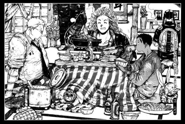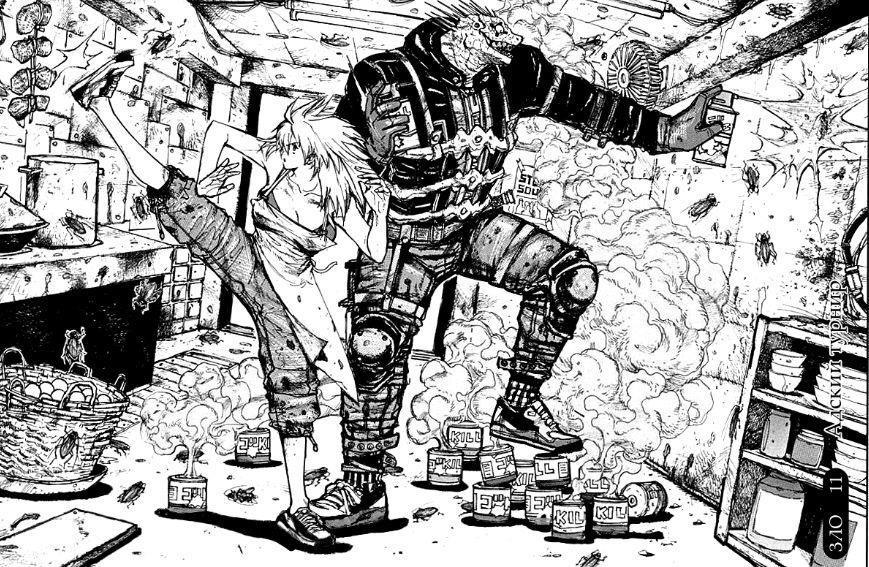 Шестое – стиль. Дорохедоро – одна из самых стильных манг, которые я только читал. Рисовка настолько детальная, что можно залипать подолгу чуть ли ни в каждый фрейм, гранж и нуарные нотки, что может быть лучше? Справедливости ради скажу, что есть сканы, которые набросаны скетчами, но их не много и впечатления они не портят. Хаясида Кю сумела смешать жестокость, своеобразный юмор, визуальные образы магов (носящих маски аля Slipknot), детальную рисовку расчленёнки и окружения так, что всё вместе это создаёт действительно оригинальный мир, где всё так мрачно, но при этом красиво и смешно.