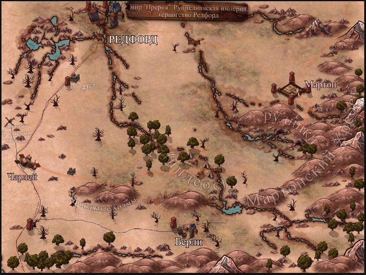Карта местности в конце первого романа и в начале второго. Место окончания первого романа помечено крестиком. Создано в inkarnate.com