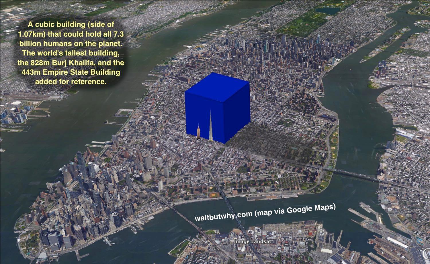 Вот такой куб со стороной 1,07 км, расположенные на острове Манхэттен в Нью-Йорке, может вместить 7,3 млрд людей, проживающих на нашей планете. Для сравнения рядом с кубом помещены небоскрёбы-рекордсмены: Бурж Халифа (828 м) и Эмпайр-стейт-билдинг (443 м).