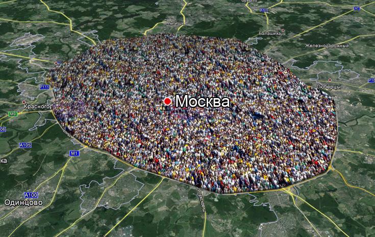 Если всех жителей Земли собрать в одном месте, то получится круг радиусом всего лишь в 80–90 км, т. е. все люди планеты могут поместиться внутри бетонки, окружающей Москву.