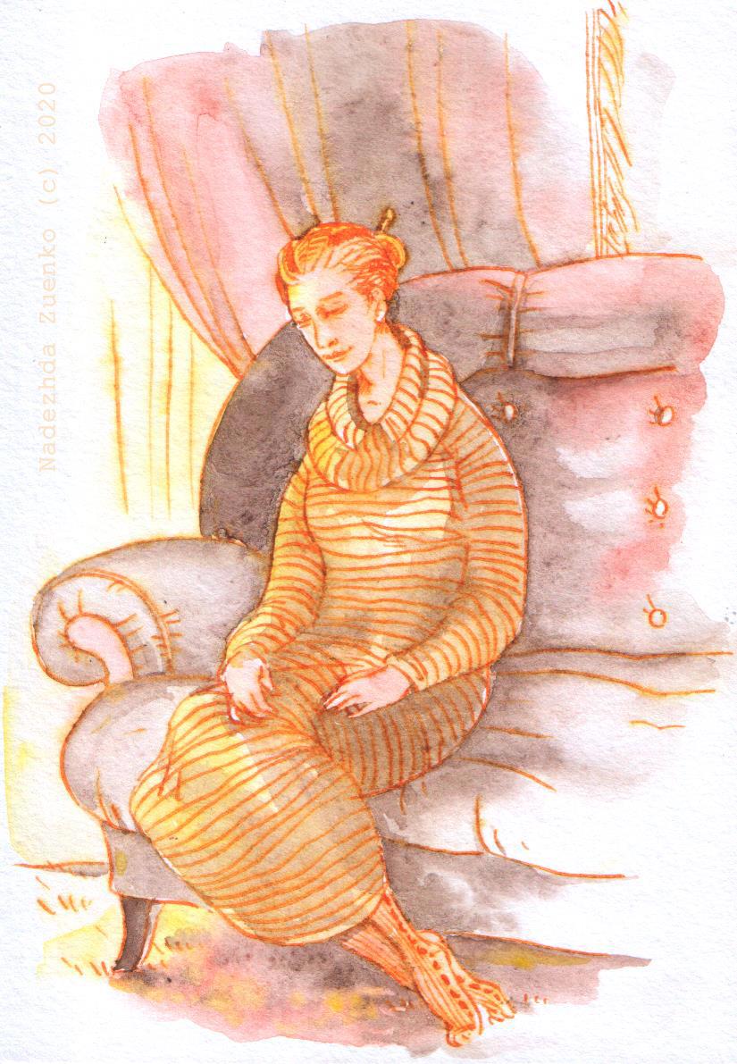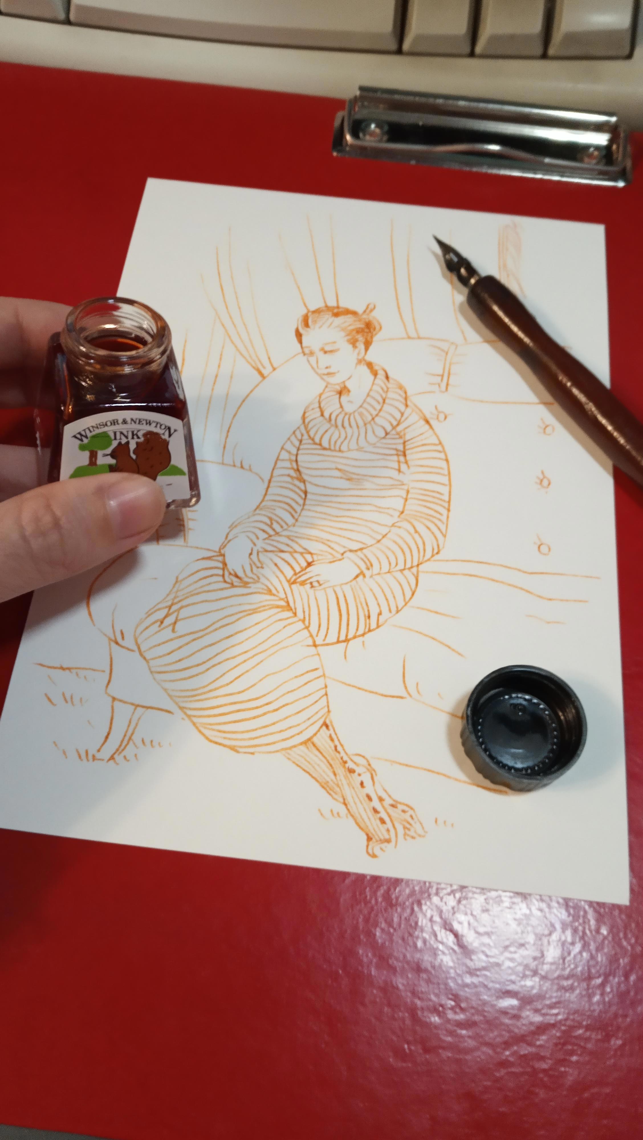 А сегодня я забрала прикупленную по распродаже на Вайлдберри Winsor&Newton Drawing Inks цвета "сиена жженая". Она на основе шеллака, а не акрила, поэтому водостойкая только отчасти, немного смывается водой и даёт этакий оттенок, объединяющий воедино картинку. Главное, цвета заливок должны хорошо смешиваться с базовым оттенком.