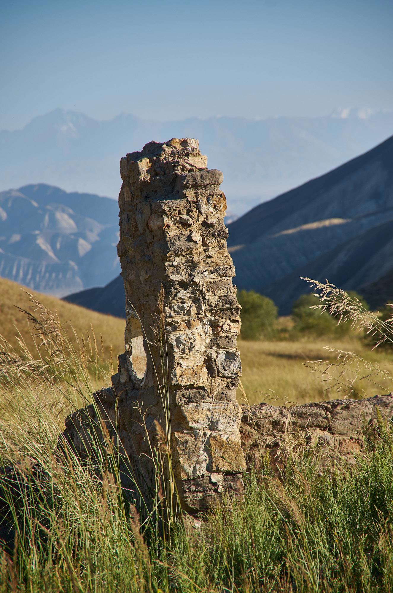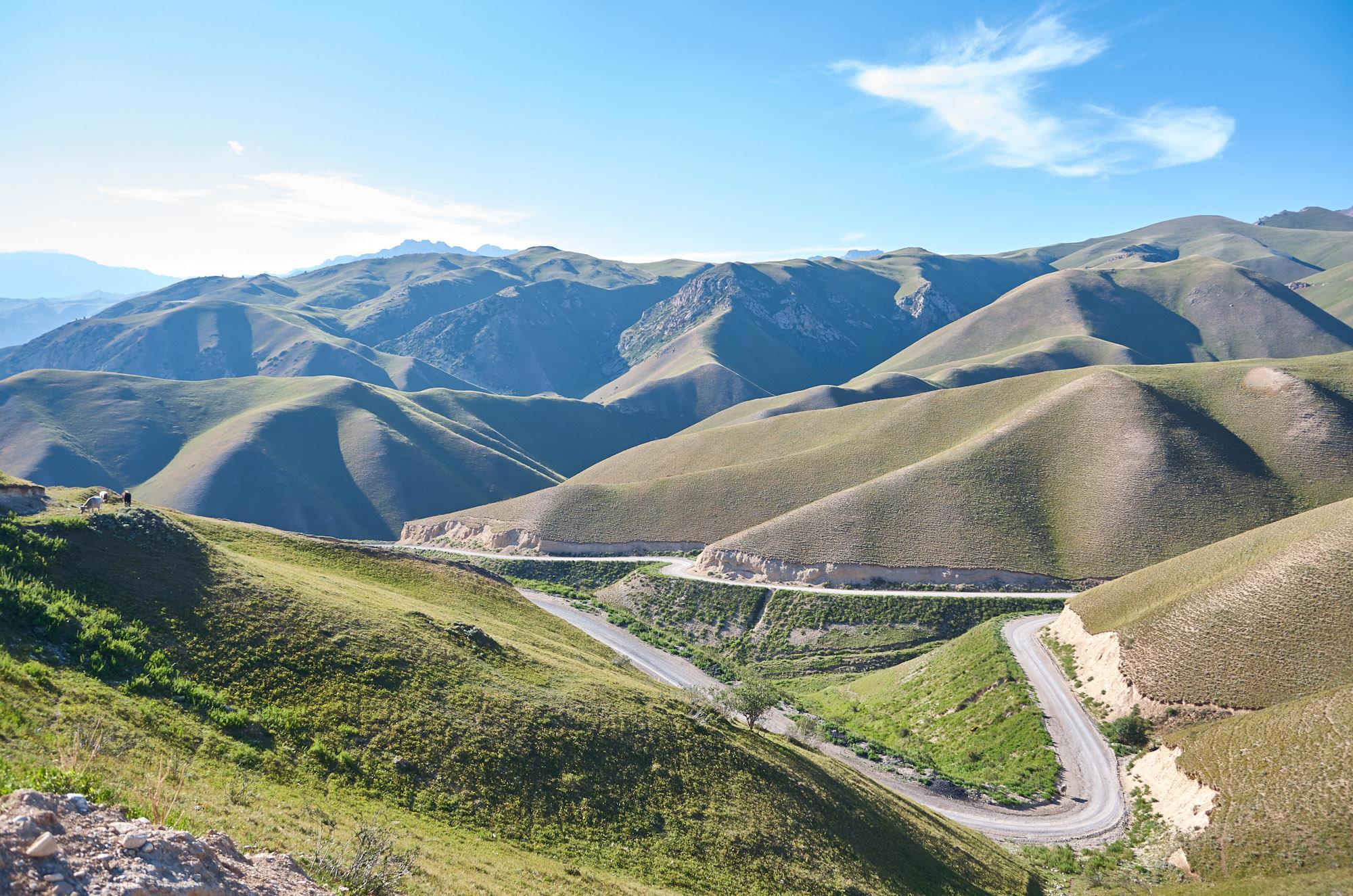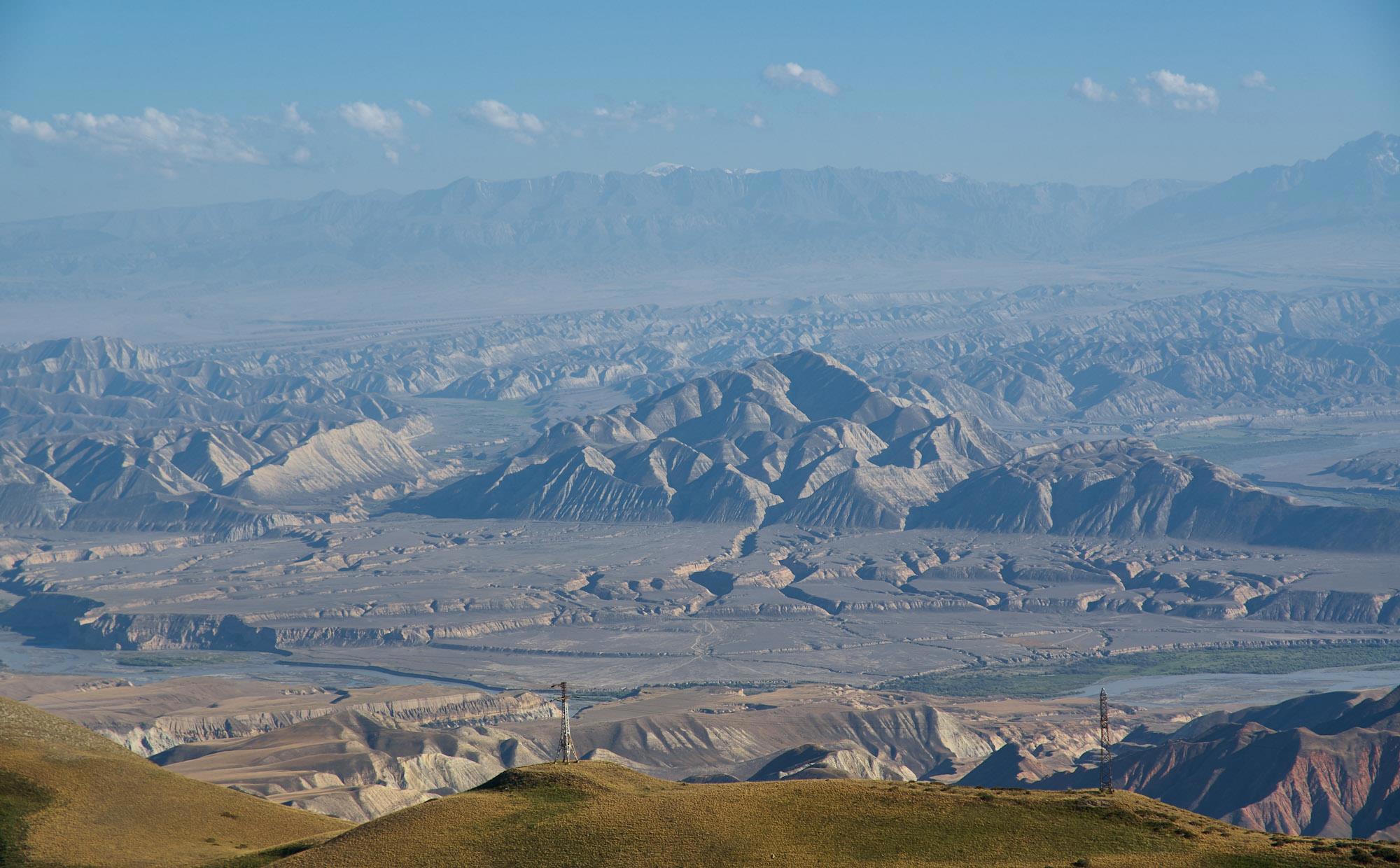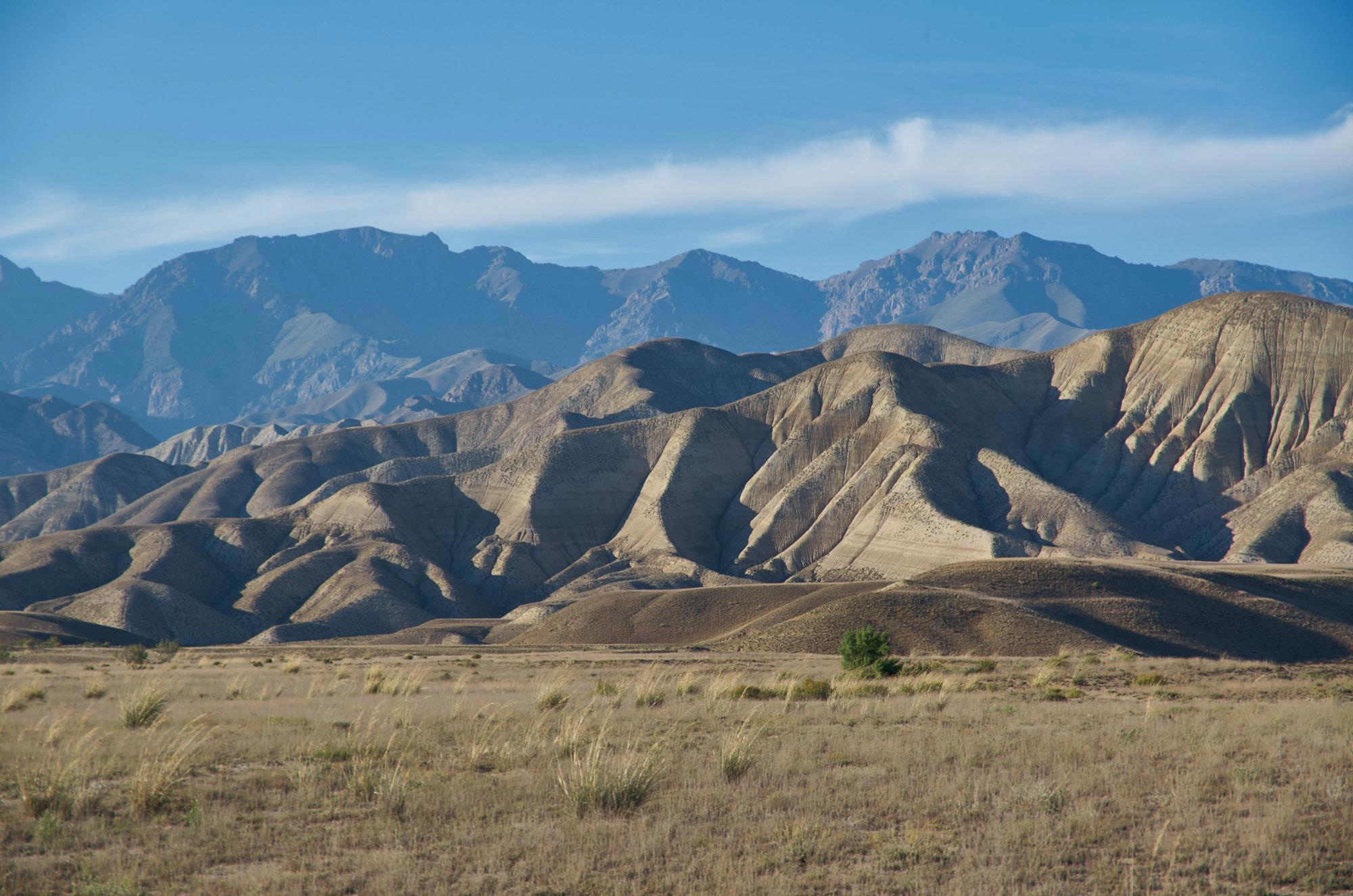 Мы относительно быстро спускаемся на горное плато, но наши надежды на повышение скорости движения не сильно оправдываются, ровных участков и здесь практически нет, грейдер местами идет настоящими волнами, скорость выше 60-70 становится опасной. Хотя на большом джипе это бы не было проблемой. Характер местности тем временем в очередной раз кардинально меняется. Заметно, что она засушливая, горы и холмы становятся палевыми, как будто подернутыми пылью, и более мягких очертаний. Далеко за ними синеют высоченные хребты Тян-Шаня. Выше этой горной страны только Тибет и Гималаи.