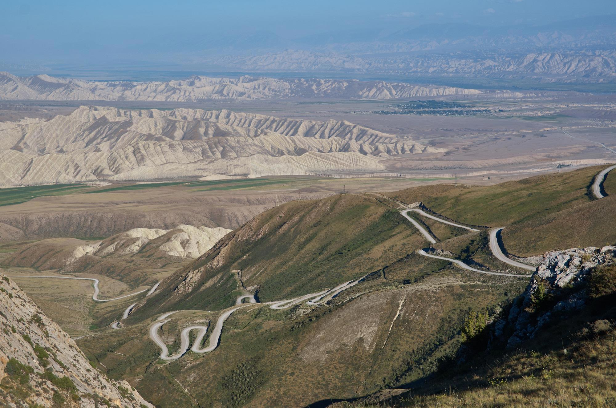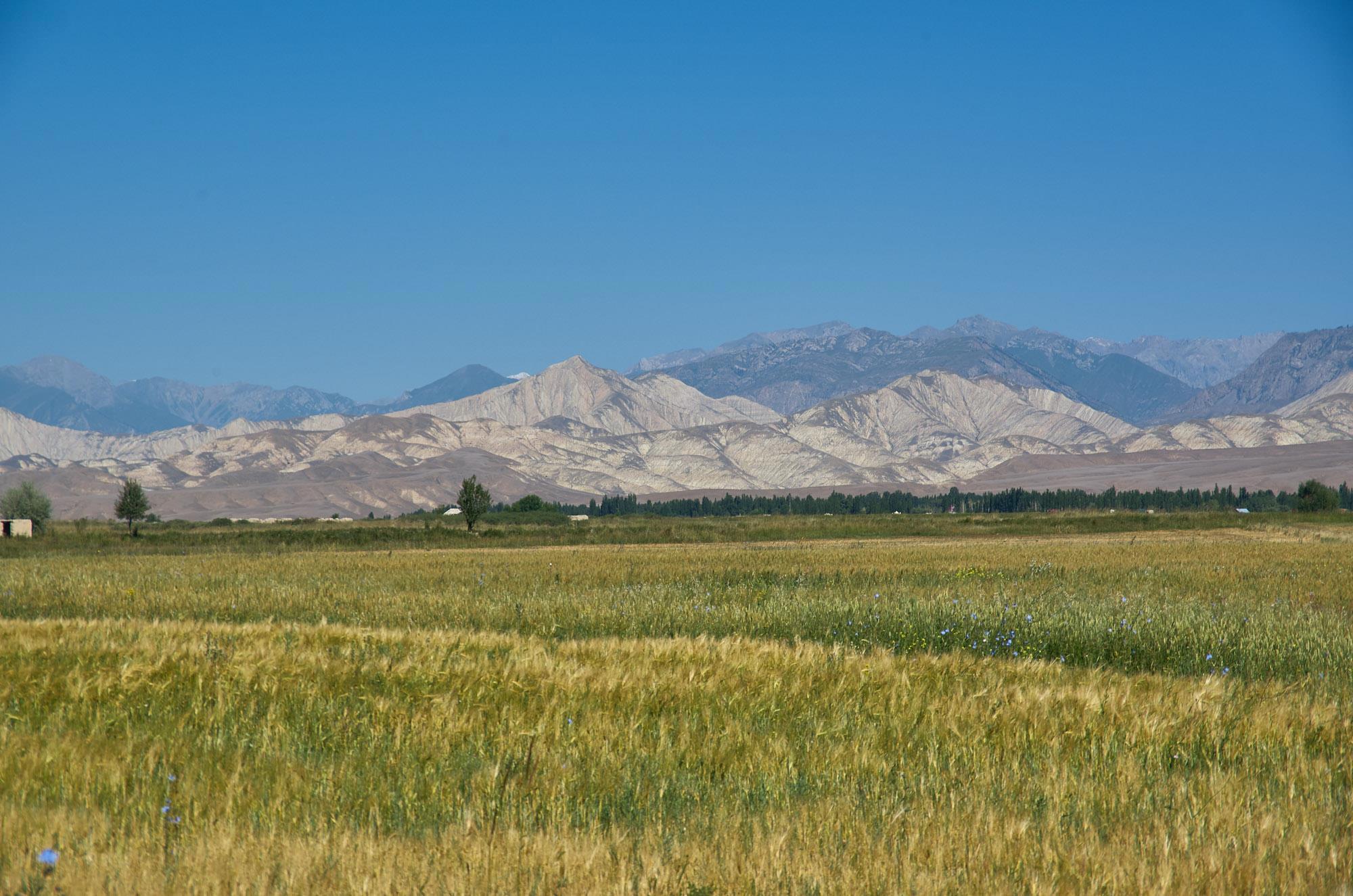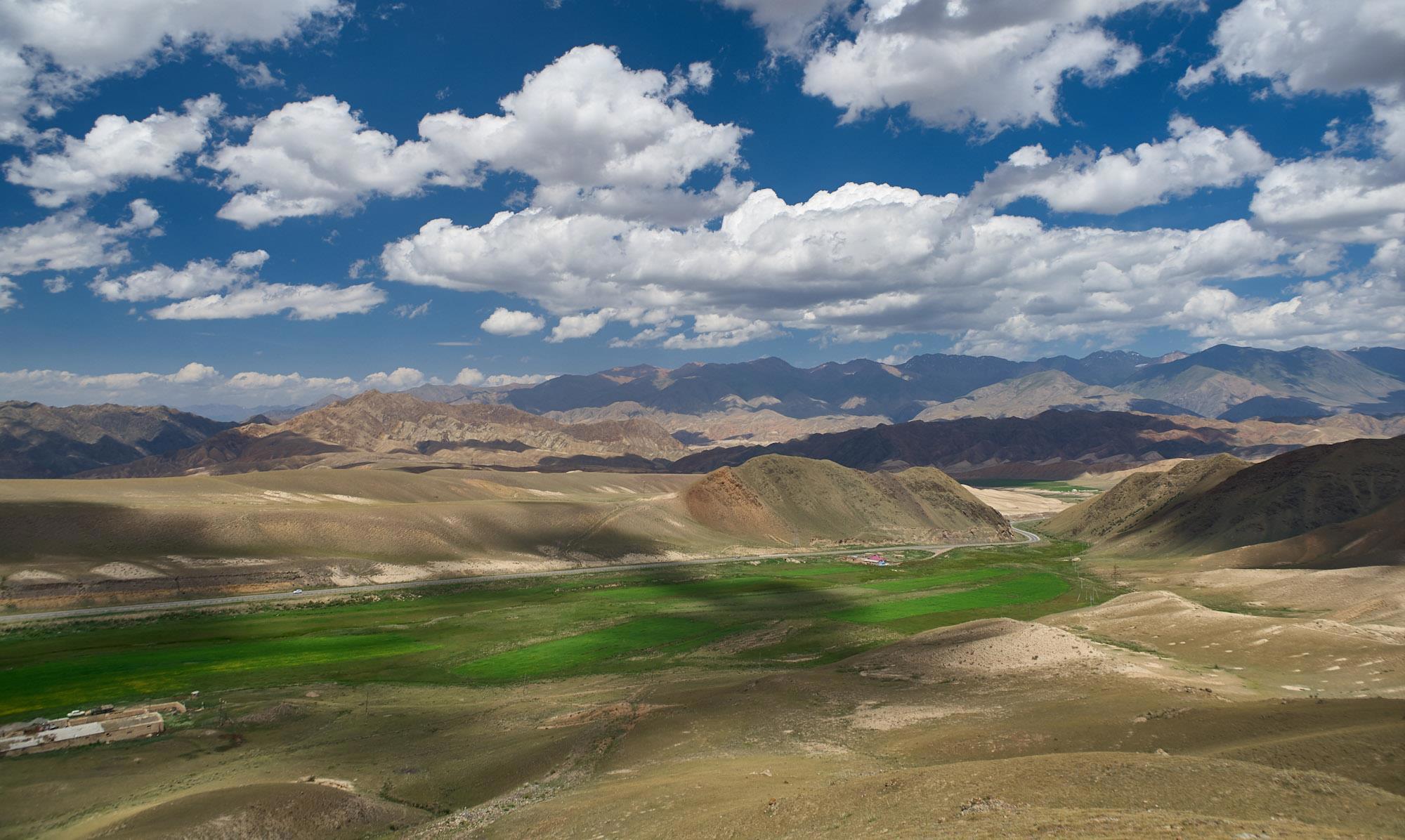 Мы относительно быстро спускаемся на горное плато, но наши надежды на повышение скорости движения не сильно оправдываются, ровных участков и здесь практически нет, грейдер местами идет настоящими волнами, скорость выше 60-70 становится опасной. Хотя на большом джипе это бы не было проблемой. Характер местности тем временем в очередной раз кардинально меняется. Заметно, что она засушливая, горы и холмы становятся палевыми, как будто подернутыми пылью, и более мягких очертаний. Далеко за ними синеют высоченные хребты Тян-Шаня. Выше этой горной страны только Тибет и Гималаи.