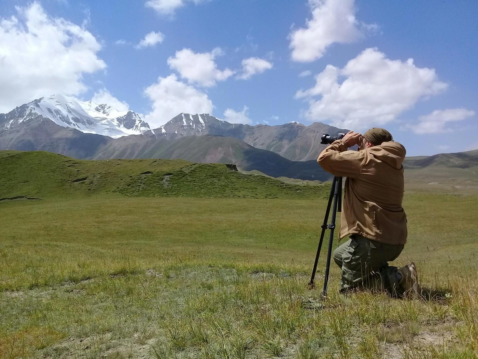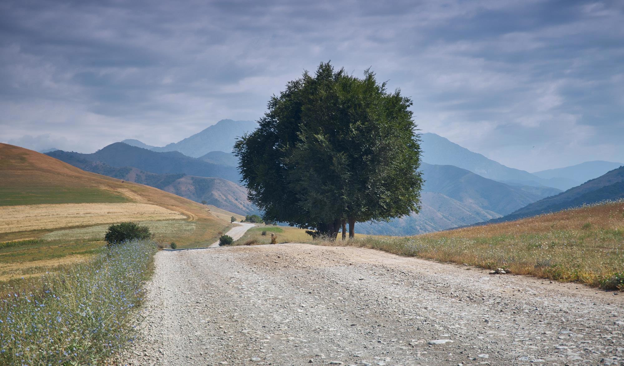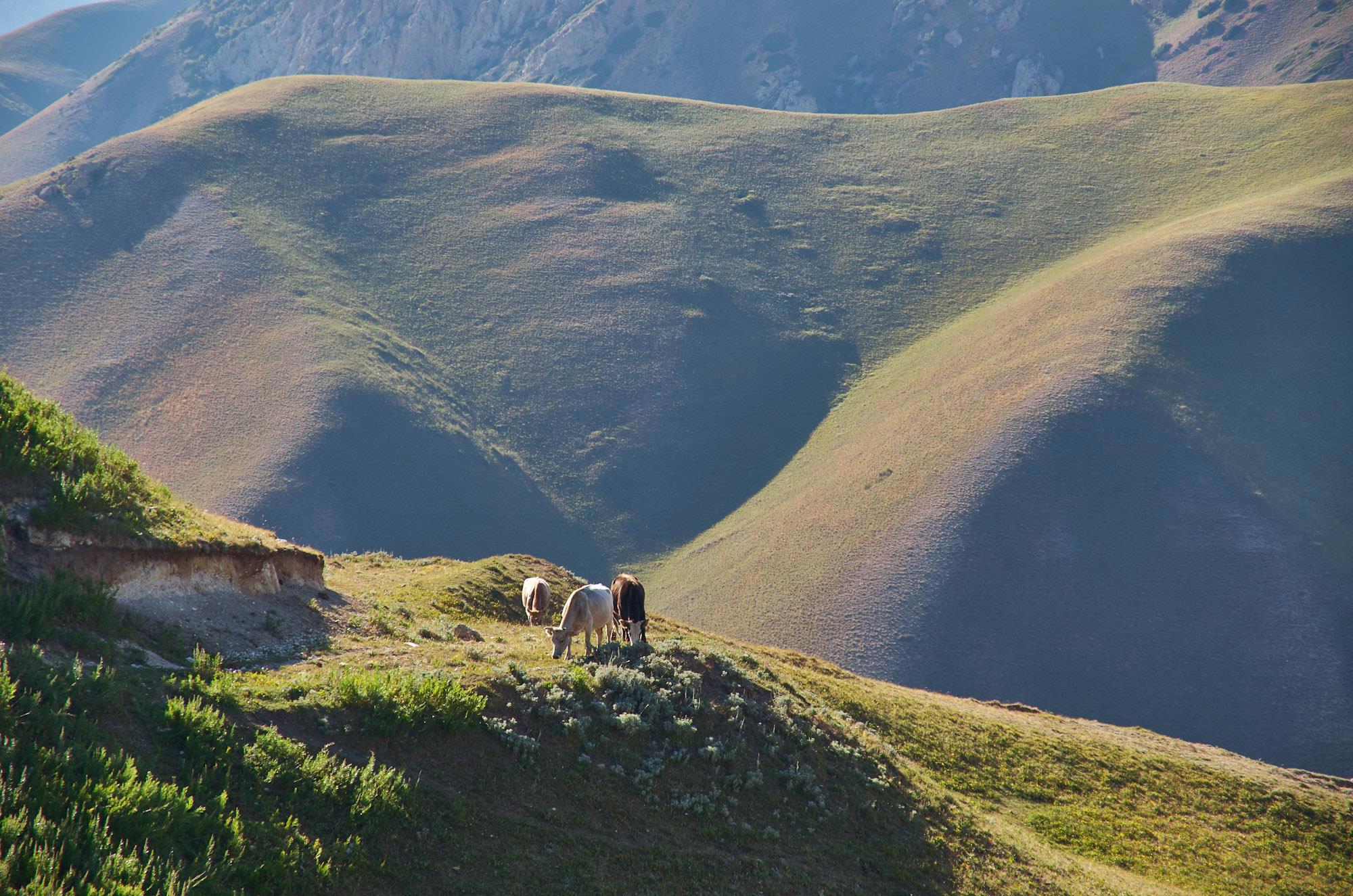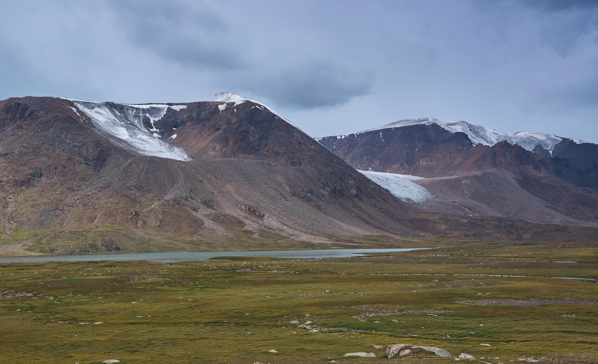Мы относительно быстро спускаемся на горное плато, но наши надежды на повышение скорости движения не сильно оправдываются, ровных участков и здесь практически нет, грейдер местами идет настоящими волнами, скорость выше 60-70 становится опасной. Хотя на большом джипе это бы не было проблемой. Характер местности тем временем в очередной раз кардинально меняется. Заметно, что она засушливая, горы и холмы становятся палевыми, как будто подернутыми пылью, и более мягких очертаний. Далеко за ними синеют высоченные хребты Тян-Шаня. Выше этой горной страны только Тибет и Гималаи.