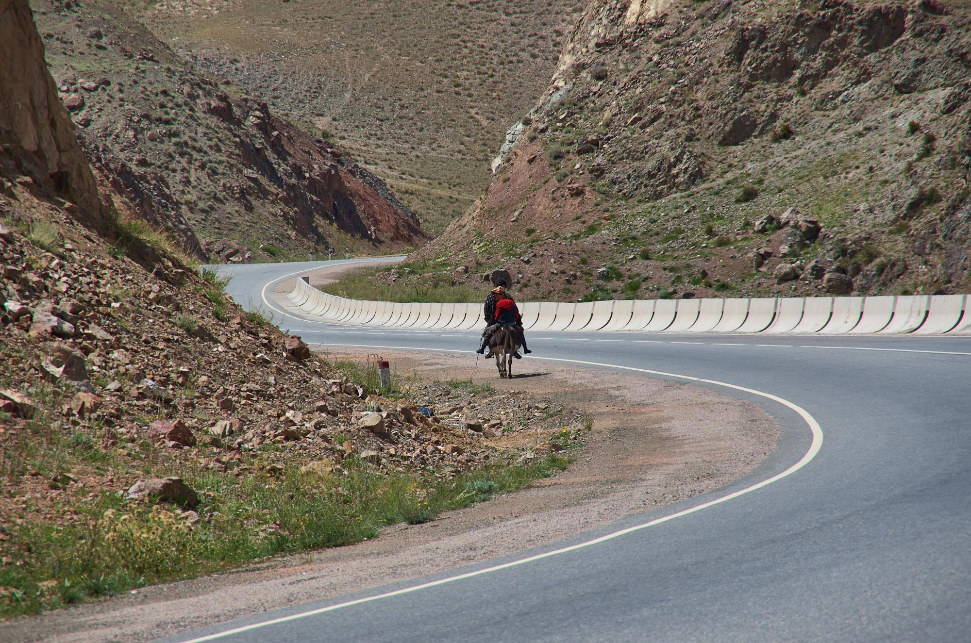 Дорога уже ничем особенным не удивляет, движемся по долине, неторопливо петляя между гор. Мы даже не делаем остановку на трехкилометровом перевале Долон, перелетев через него насквозь. Тормознули только для фотосета, поймав неплохой свет. Иногда на дороге попадаются и вот такие всадники. Кочевники народ простой, запросто пересаживаются с дорогого джипа на лошадь. Временами на летних пастбищах можно наблюдать забавную картинку: около вагончика, который во многих местах сейчас заместо юрты, стоит старый "Москвич", а рядом люксовый "Лексус".