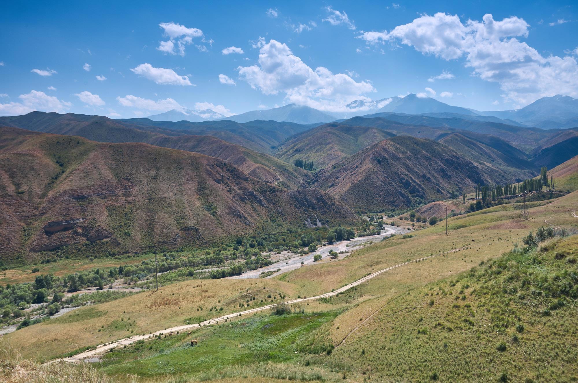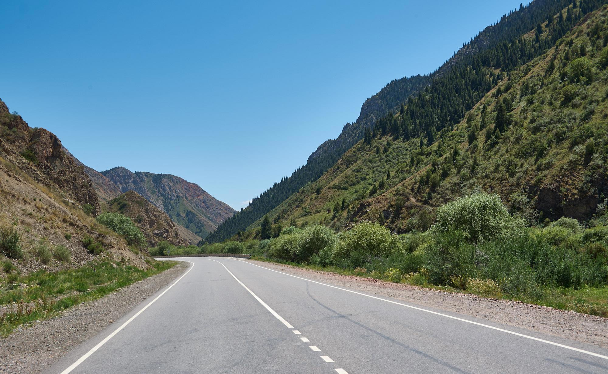 Дорога в целом однообразна, далекие горы по бокам плоскогорья, где-то рядом петляет река Нарын, путь пролегает через небольшие поселки. Вот автомобилистам в них надо быть поосторожней. Местные жители понаставили странных "лежачих полицейских", которые совсем не обозначены знаками и грозят колесам конкретными неприятностями. Понятно, что их сделали против гонщиков, я очень даже верю, что в этих местах их полным-полно. И это снова означает общее падение скорости, по этой дороге и так особо не разгонишься, часты ямы и по краям полотна промоины.