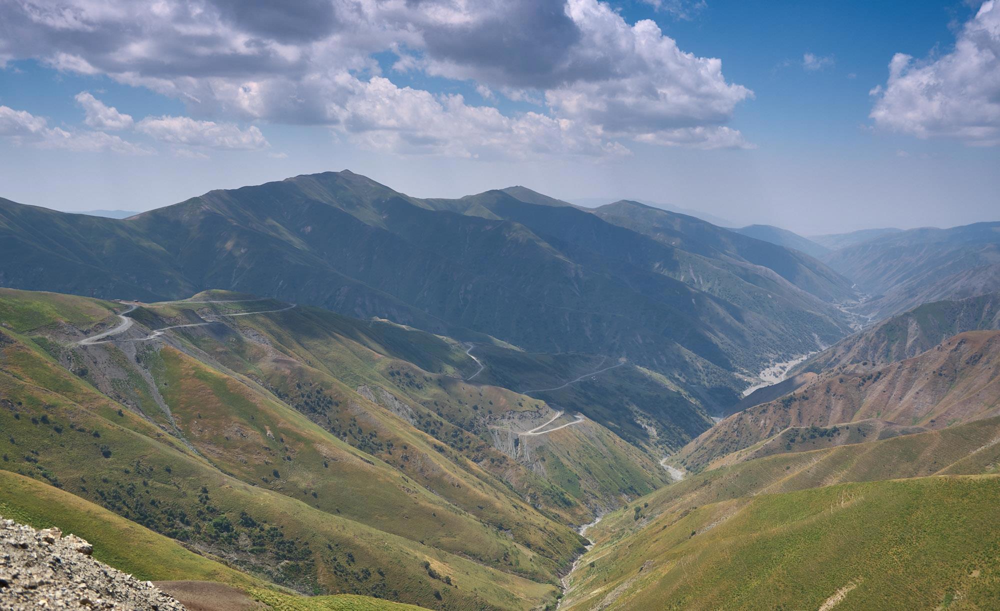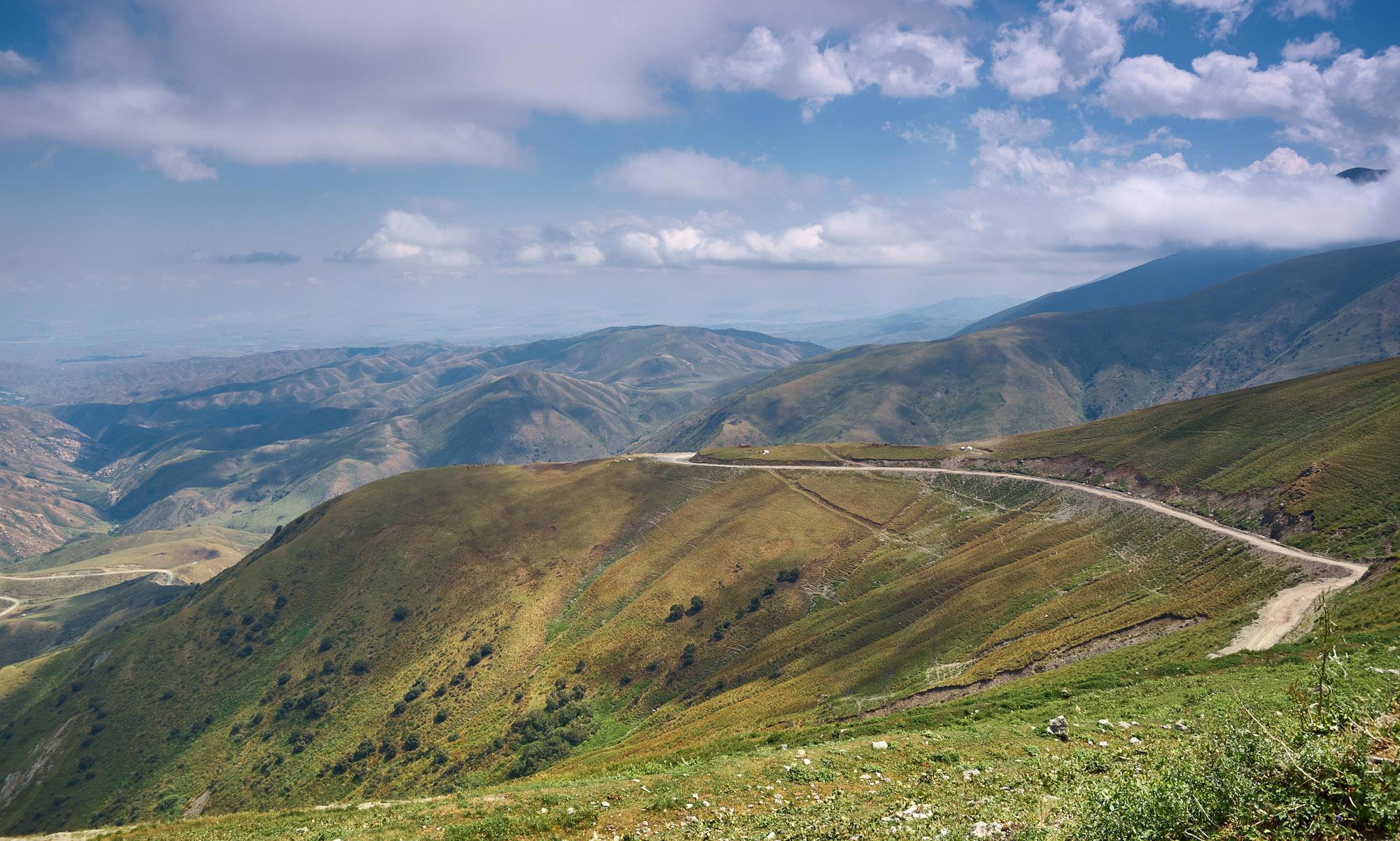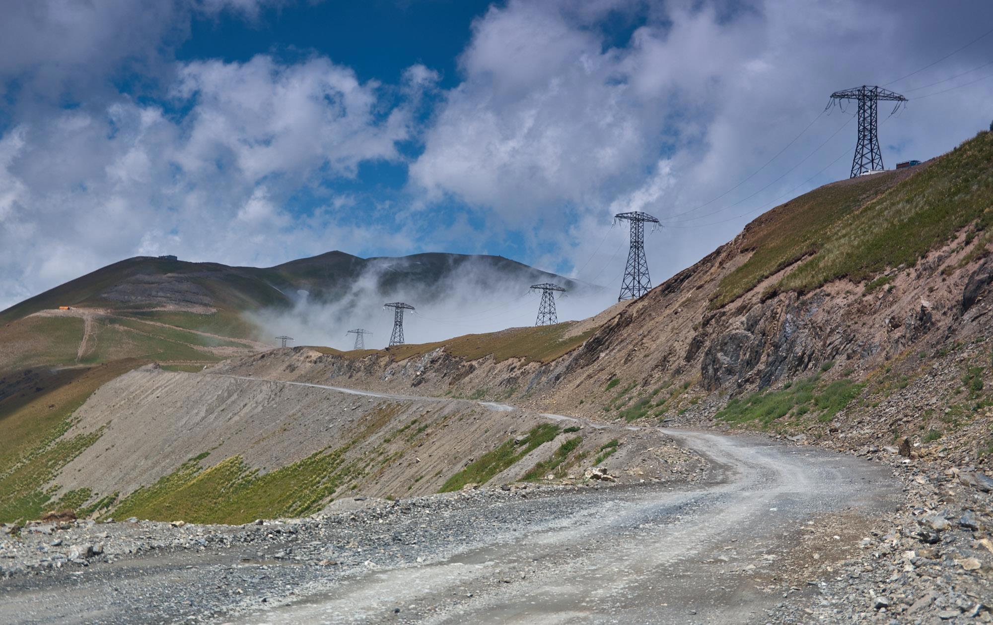 Тут выявляется наша первая ошибка в планировании, скорость движения в таких сложных условиях небольшая, не выше 30-40 км в час, поэтому к первому перевалу мы подходим только через четыре часа после выезда из города. Постепенно закручивается настоящий горный серпантин, только дорога в этот раз без отбойников, «аутентичная» с узкой каменистой проезжей частью, а с правой стороны самая настоящая пропасть. Адреналинчика, короче, хапнули. На еще большой высоте виднеется нитка ЛЭП, туда мы, похоже, и направляемся. По пути подбираем молодого шофера, он не говорит по-русски и жестами объясняет, что ему надо наверх, на перевал, чтобы поймать сеть и вызвать оттуда помощь. Видимо, перегрелся или что-то в грузовике сломалось. Серпантин вьётся дальше, унося нас на неведомую высоту.