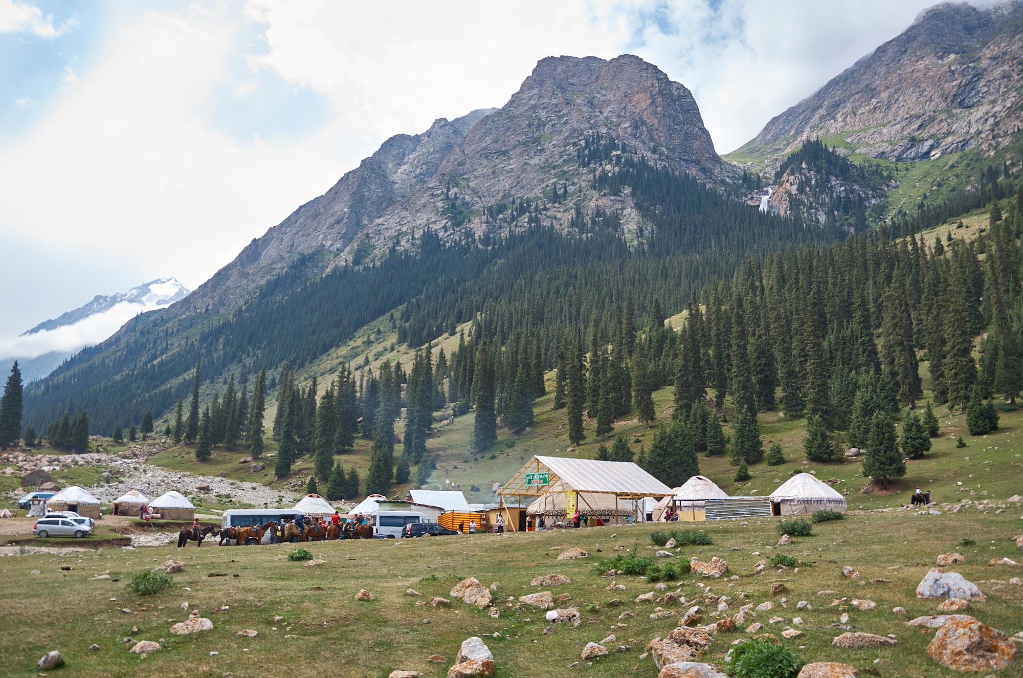 Дорога привычно бежит наверх, нас окружают высокие, поросшие тянь-шаньскими елями горы. Вскоре мы заприметили стоянку, подавляющее большинство туристов делают в этом месте обязательную остановку и дальше никуда не едут. Окрест наблюдается вездесущий околотуристический бардак, мусор, навязывание услуг по перевозке наших тушек на лошадках к водопаду. Но подниматься наверх и терять время в наши планы не входит. Как-то это все особо не впечатляет. Снимаем памятник Гагарину, он в этих местах не раз отдыхал и едем дальше. Ну а водопады я посмотрел и снял на телевик.