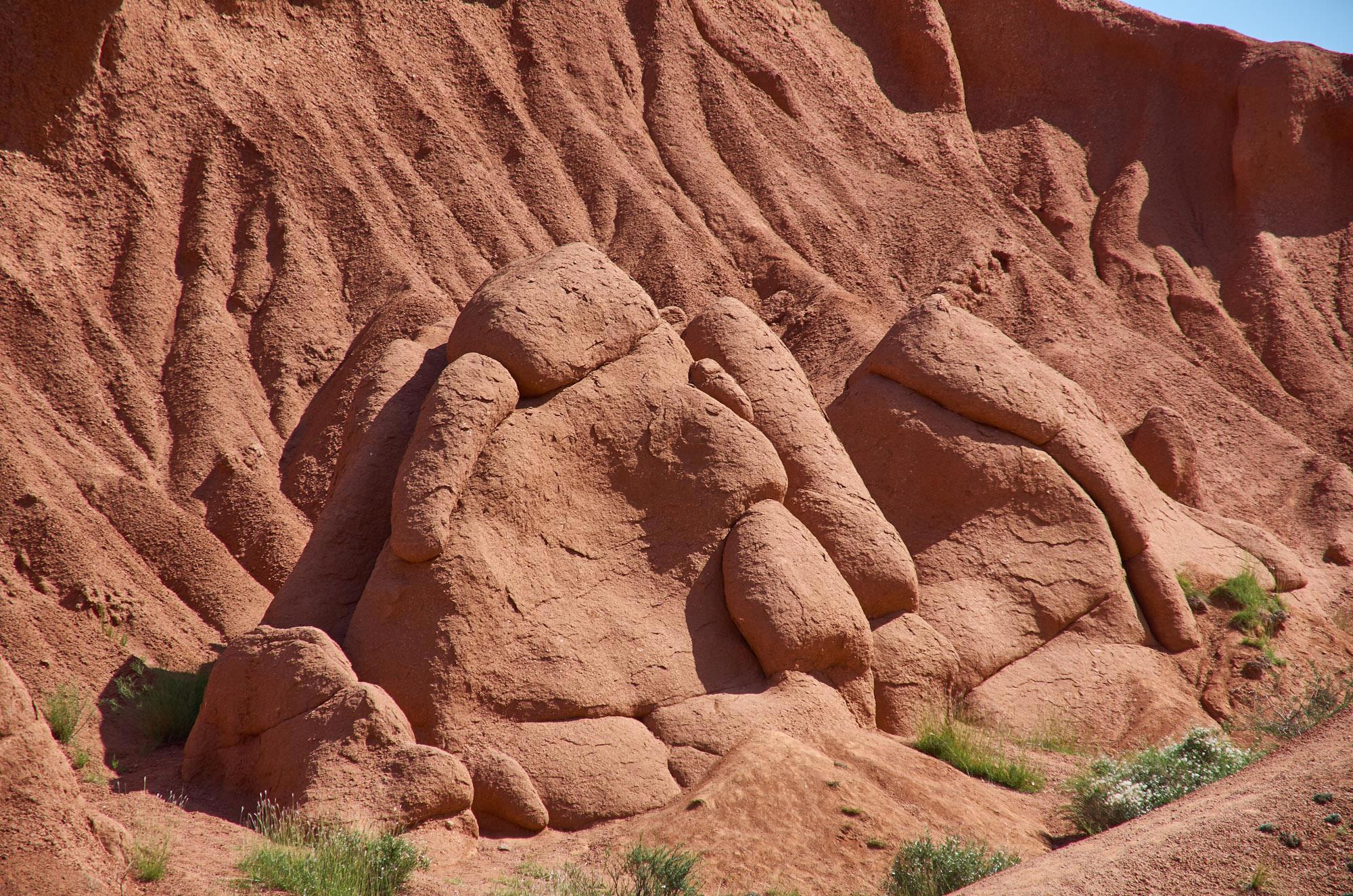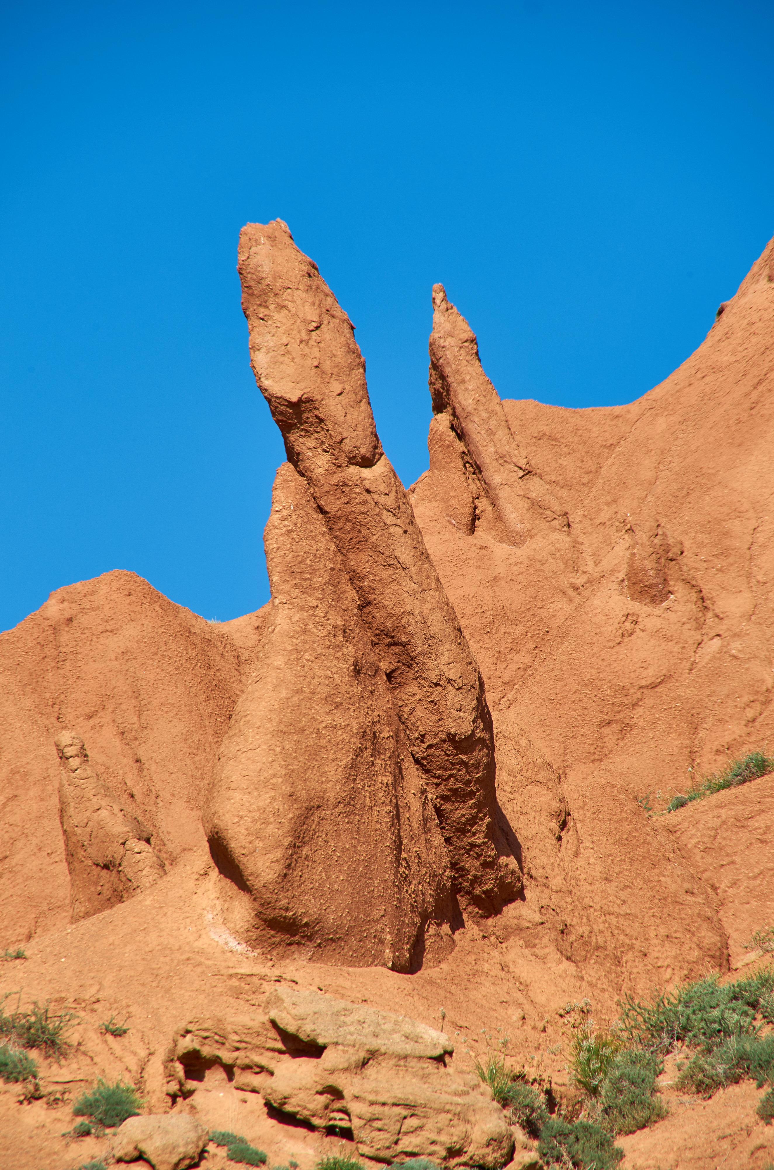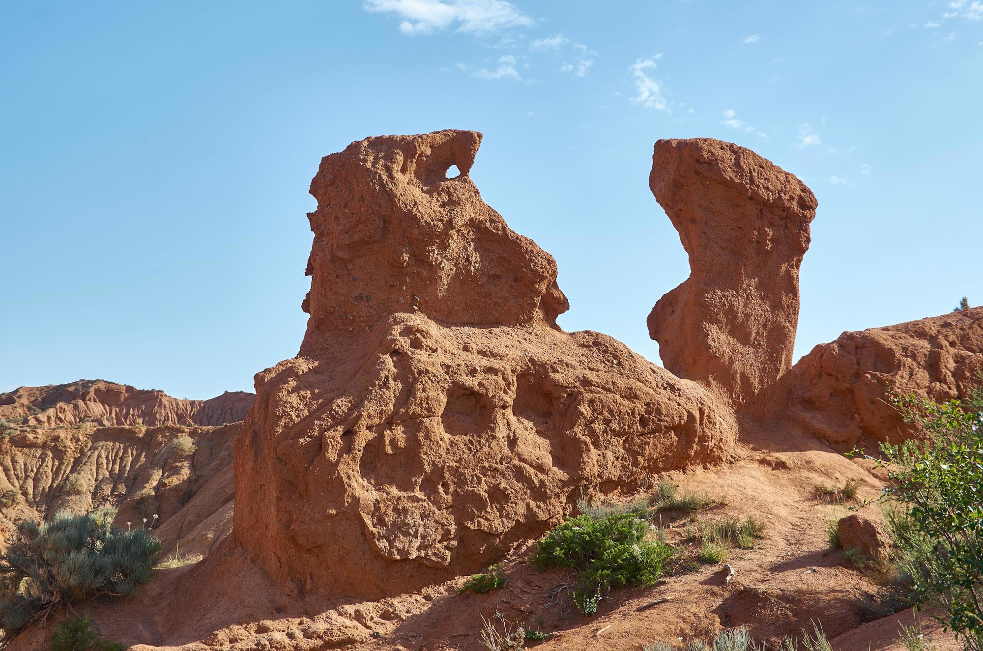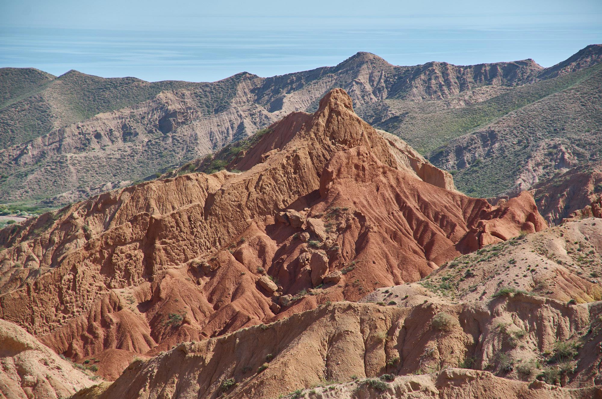При въезде в сам каньон какие-то ушлые ребята поставили шлагбаум, и лихо так собирают по пятьдесят сом с человека. Вот только за что - непонятно. На стояночной площадке нет никакого сервиса, только некие сувенирщики впаривают вам втридорога безделушки. Мы вроде и выехали пораньше, около девяти, но туристы по склонам уже вовсю ползали и постоянно лезли мне в кадр, пришлось сразу уйти подальше. Солнце между тем поднималось все выше и выше, накаляя скалы и глинистые склоны, вода у нас заканчивалась, свет становился не фактурным, так что проходили мы по этому каньону в первый раз меньше двух часов. Все пространство заполнено восхитительным и необычно красивым ландшафтом. Такое впечатление, что это дети неких гигантов поиграли здесь, как в песочнице, создавая фигурки зверюшек или замысловатых замков, да так и бросили. Последствия «пикника на обочине». Яркие, совершенно нереалистичные краски только дополняют необычность этого чудного местечка.