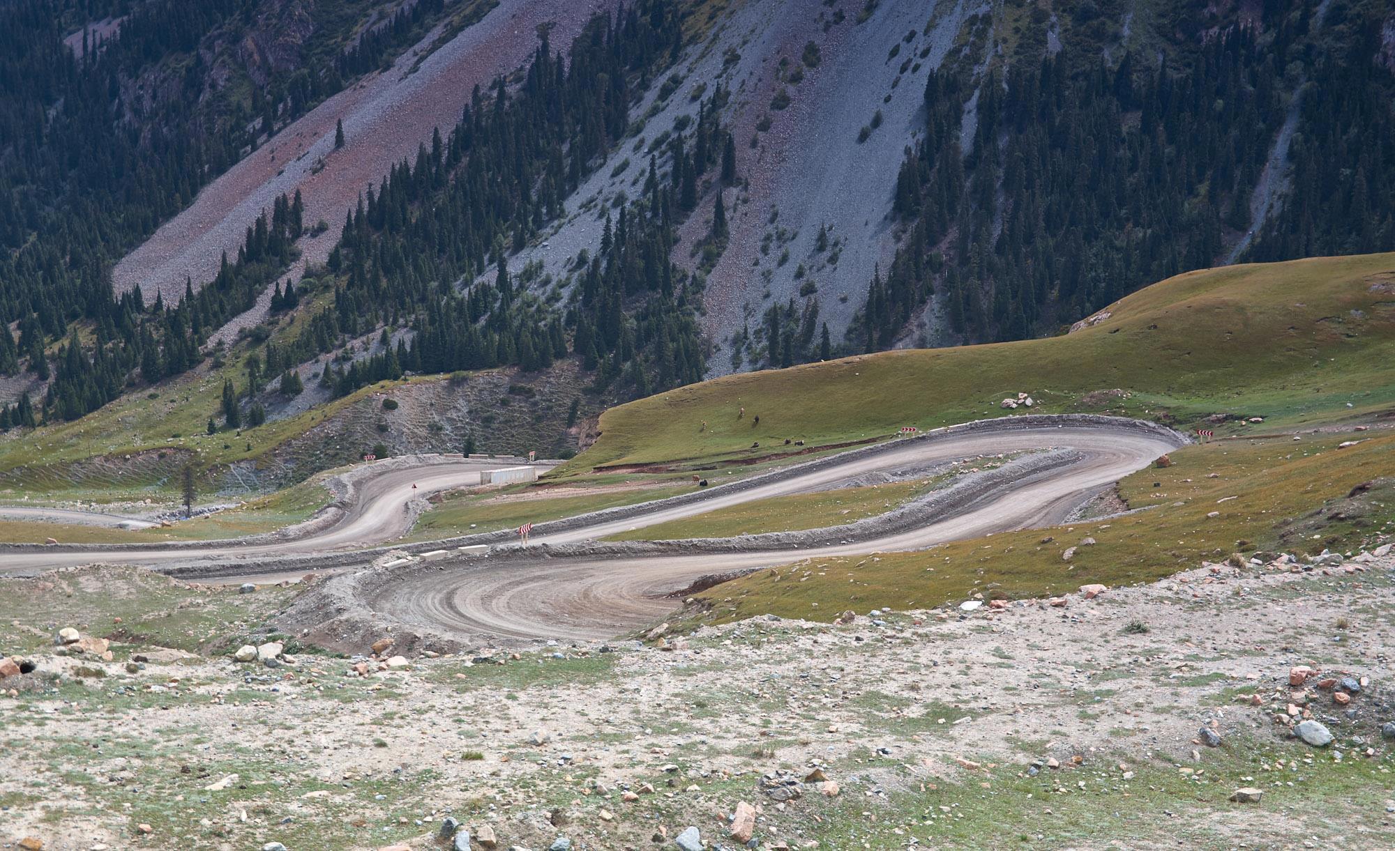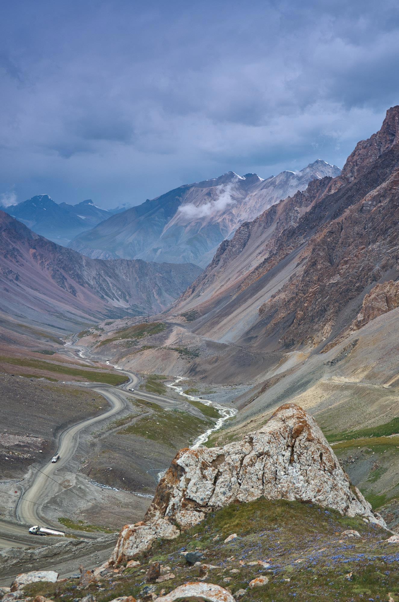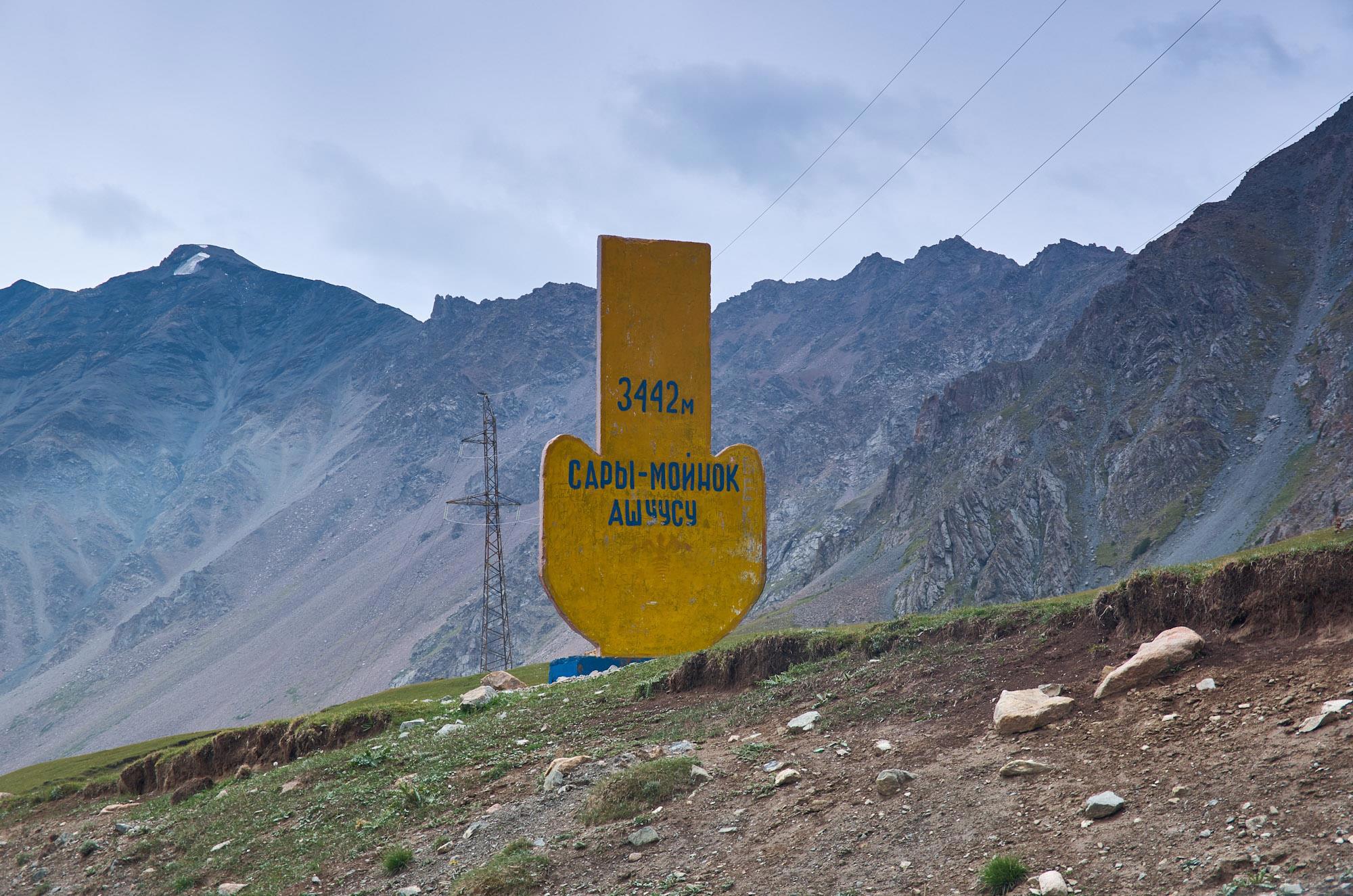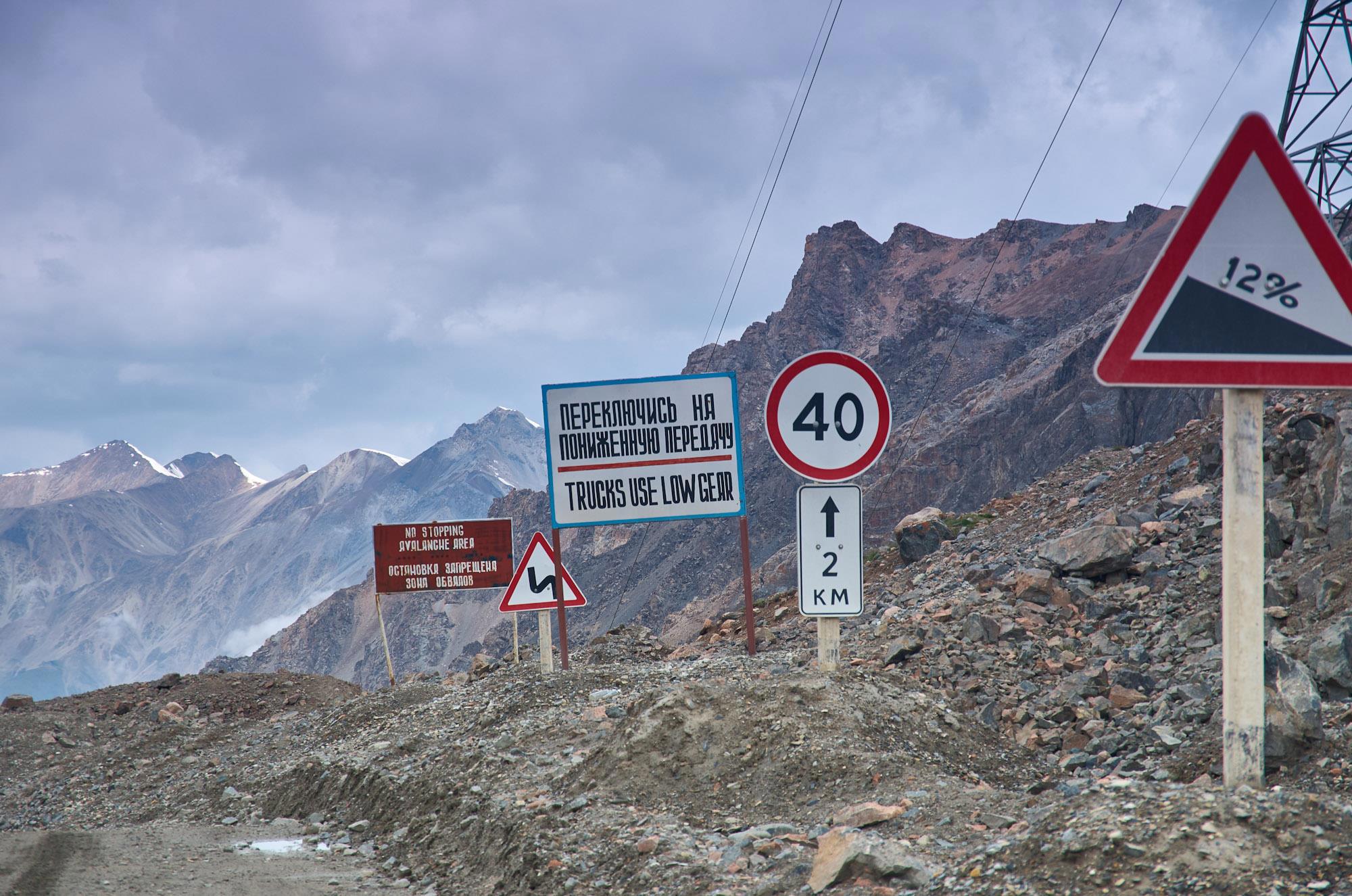 Очень крутой даже по сравнению с предыдущими серпантин ведет нас на первый перевал, уши привычно закладывает, но мы топим вверх уверенно, тем более что дорожное полотно отличное, рассчитано на большие тягачи с грузом. Постоянно попадаются предупреждающие знаки и площадки для аварийной остановки. Вскоре мы оказываемся на перевале Сары-Мойнок, 3442м. Такой вот стремительный в этом ущелье подъем. Виды на горы совсем другие, кажется, что мы с солнечного юга волшебным образом попали обратно на Север. Далеко внизу наблюдаются тяжело ползущие вверх грузовики. Даже наш мощный "Лексус" в этот раз пёр с напрягом, время от времени я давал ему отдохнуть. Временами создавалось странное ощущение, когда давишь газ по полной, а довольно мощный кроссовер ползет как черепаха.