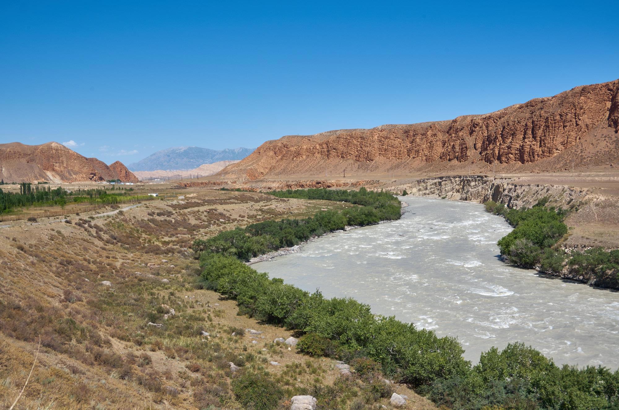 Но мы окончания "банкета" дожидаться не стали, и так потеряли полчаса времени, свернули согласно указанию навигатора направо и двинулись в сторону озера Сен-Кюль, такого далекого и высокогорного. Вначале дорога идет посреди небольших поселков, там только что закончили ремонт дорожного полотна, рабочие занимались обочинами и благоустройством, а мы гнали по отличной трассе, втайне надеясь, что она будет идти и дальше. Но ... очередной поворот налево, и начинался обычный, пыльный до невозможности деревенский грейдер, асфальта в этот день нам увидеть было не суждено. Добро пожаловать в настоящие горы! Вскоре показалась река Кара-Алма с очень обрывистым и живописным берегом.