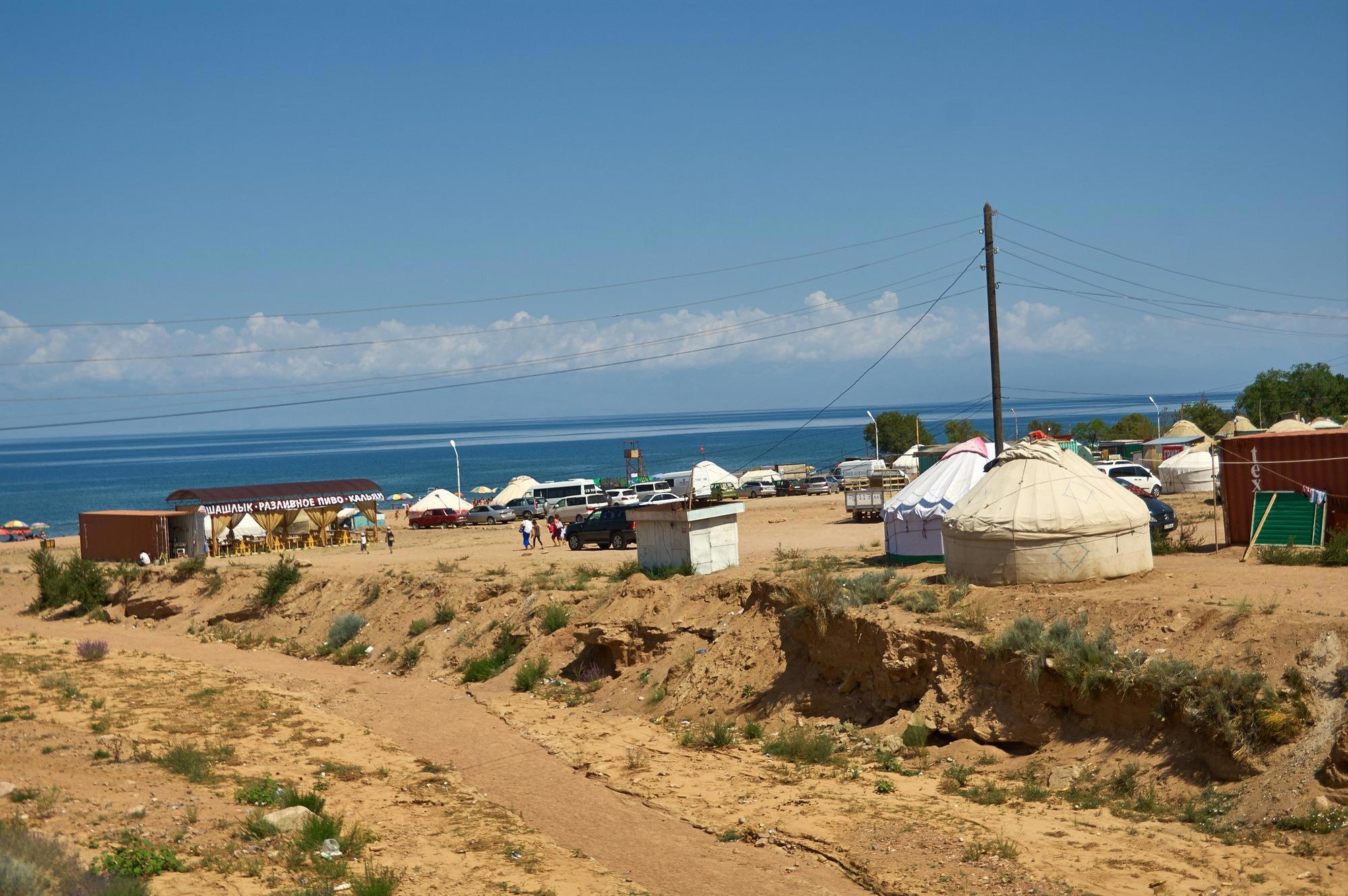 Еще около часа не самой быстрой езды и мы, наконец, подъезжаем к заветному озеру Иссык-Куль. Здесь у нас намечен чисто "пляжный" отдых с короткими вылазками на природу. Хватит «мучать» супругу дикостью и экзотикой. Погреть на солнце пузо тоже полезно.
