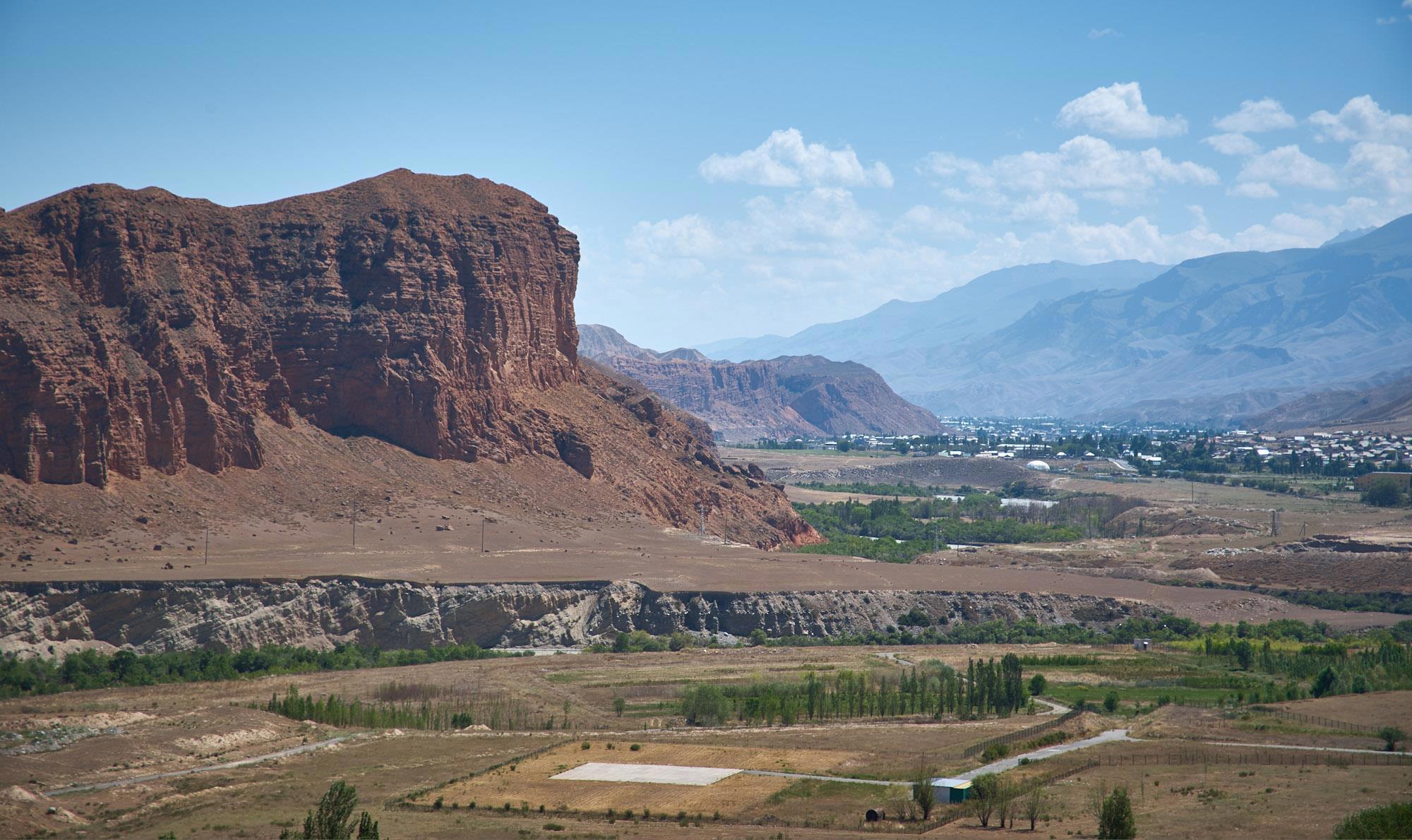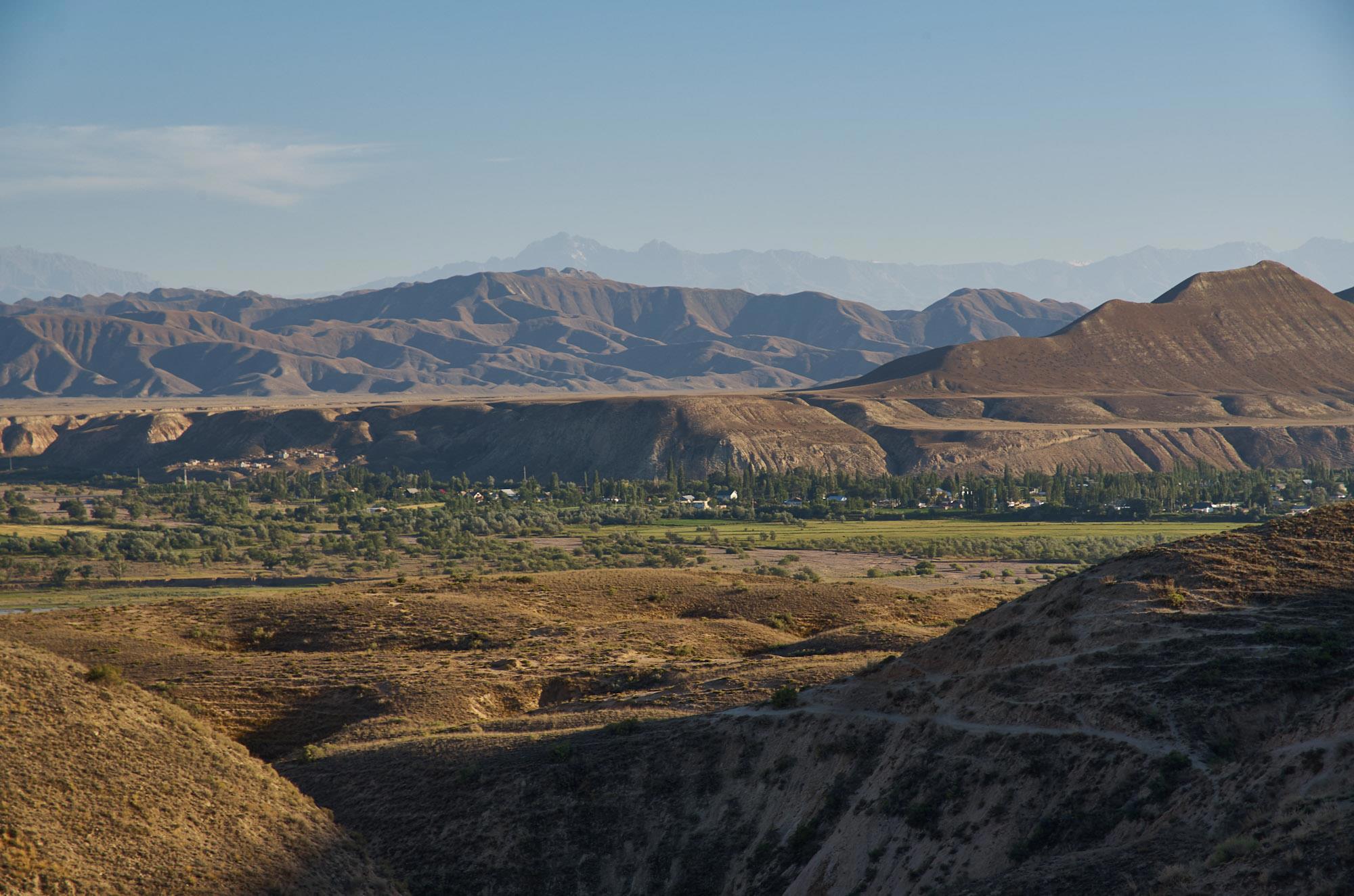 Между холмами из известняков появляются зеленеющие растительностью долины и небольшие аилы, окружённые стенами гор.