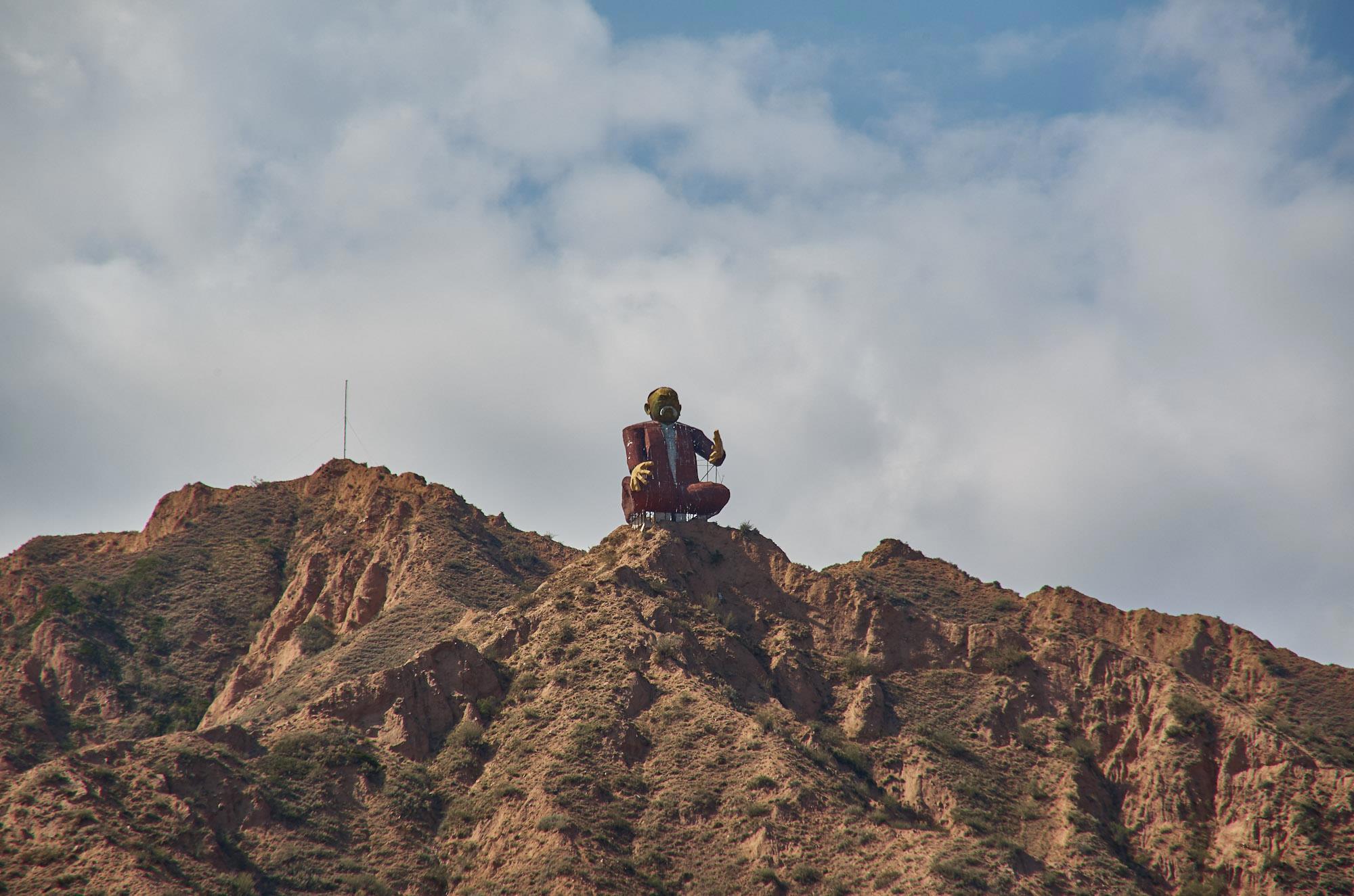Так что через пару дней мы снова решились на познавательные выезды и смотались в Каньон Сказка. Сразу за Каджи-Саем, на берегу находится странное незаконченное сооружение, а на горе фигура огромного мужика.