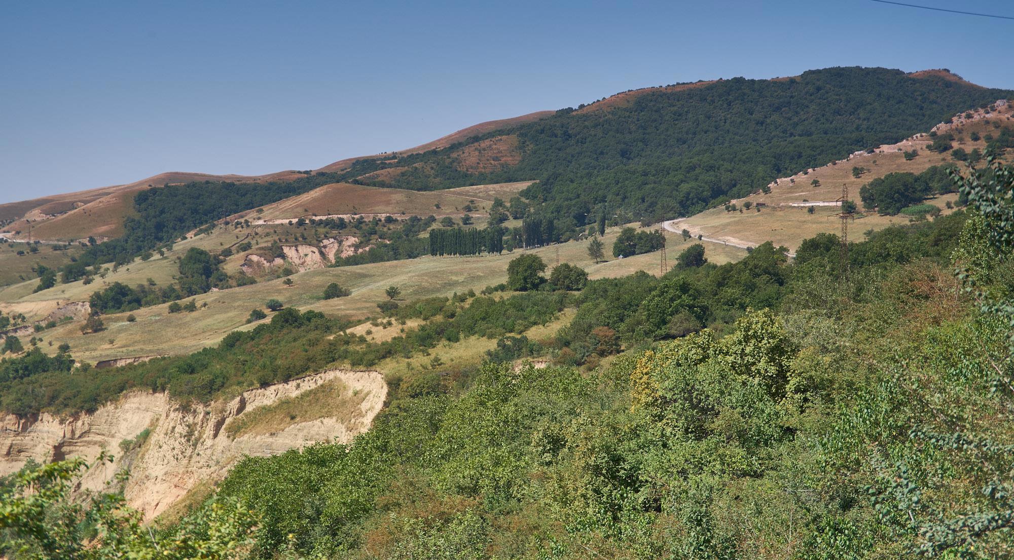 Горы как-то быстро приблизились, нас окружал милый сельский пейзаж, проехали поселок Архангельское, двигаясь все дальше к темнеющим впереди вершинам. Вокруг нас расстилались поля, растет подсолнечник, окрестности выглядят поистине умиротворяюще. Ночью прошел ливень и, видимо, после него работал грейдер, мы его потом встретили, так что разбитая местами дорога была вполне проходима даже для нашего городского кроссовера.