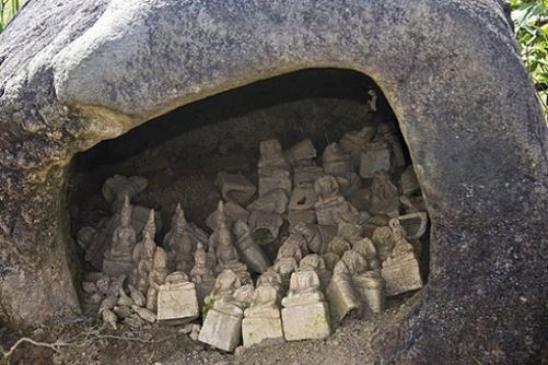 Если в изделиях из Сулавеси совершенная форма и наличие некоторых других признаков вызывало подозрение, что их изготовили из мягких материалов, то здесь никаких особых сомнений нет - вырубили из целого куска камня... вроде бы. Однако, когда думаешь об их общем количестве, то невольно хочется поискать огромную кучу отходов и поломанного инструмента... пока не нашли. Да и не искали особо. Нужно заметить, что упрекать исследователей в нежелании блукать вокруг этих свидетелей прошлого понять можно - здесь ещё не все взрывоопасные американские "подарки" обезврежены. Однако исследователи всё же кое-что делать пытались и кое-что нашли. Внутри и возле этих горшков находили зубы, стеклянные бусины, обломки керамических, каменных и бронзовых изделий, кости. Кроме того, в отдельных случаях внутри кувшинов находили миниатюрные статуи Будды.