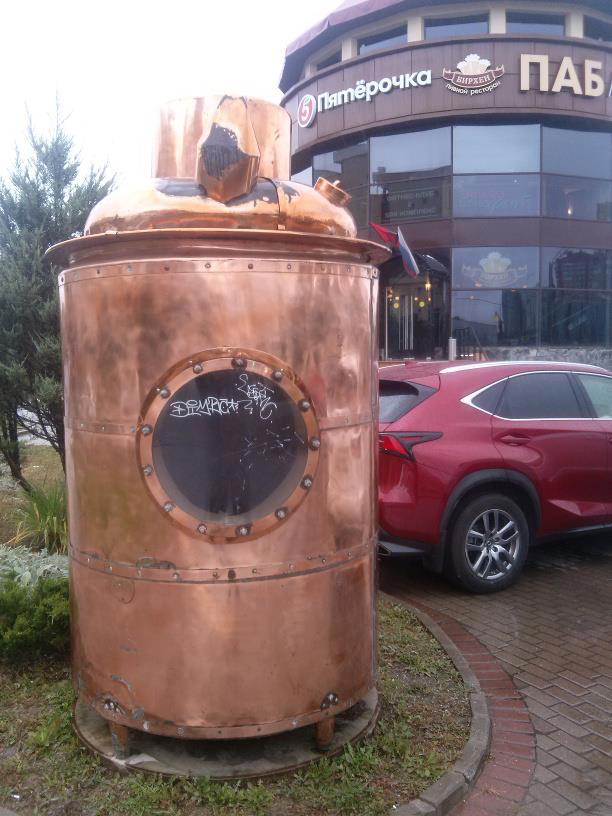 И всё же что же сие такое? Присмотревшись, можно заметить, что диковинный объект стоит перед неким зданием, на котором вывеска "ПАБ". И, тогда, вполне возможно, это не марсианский космический снаряд, не стиральная машинка - а пивоваренный агрегат?