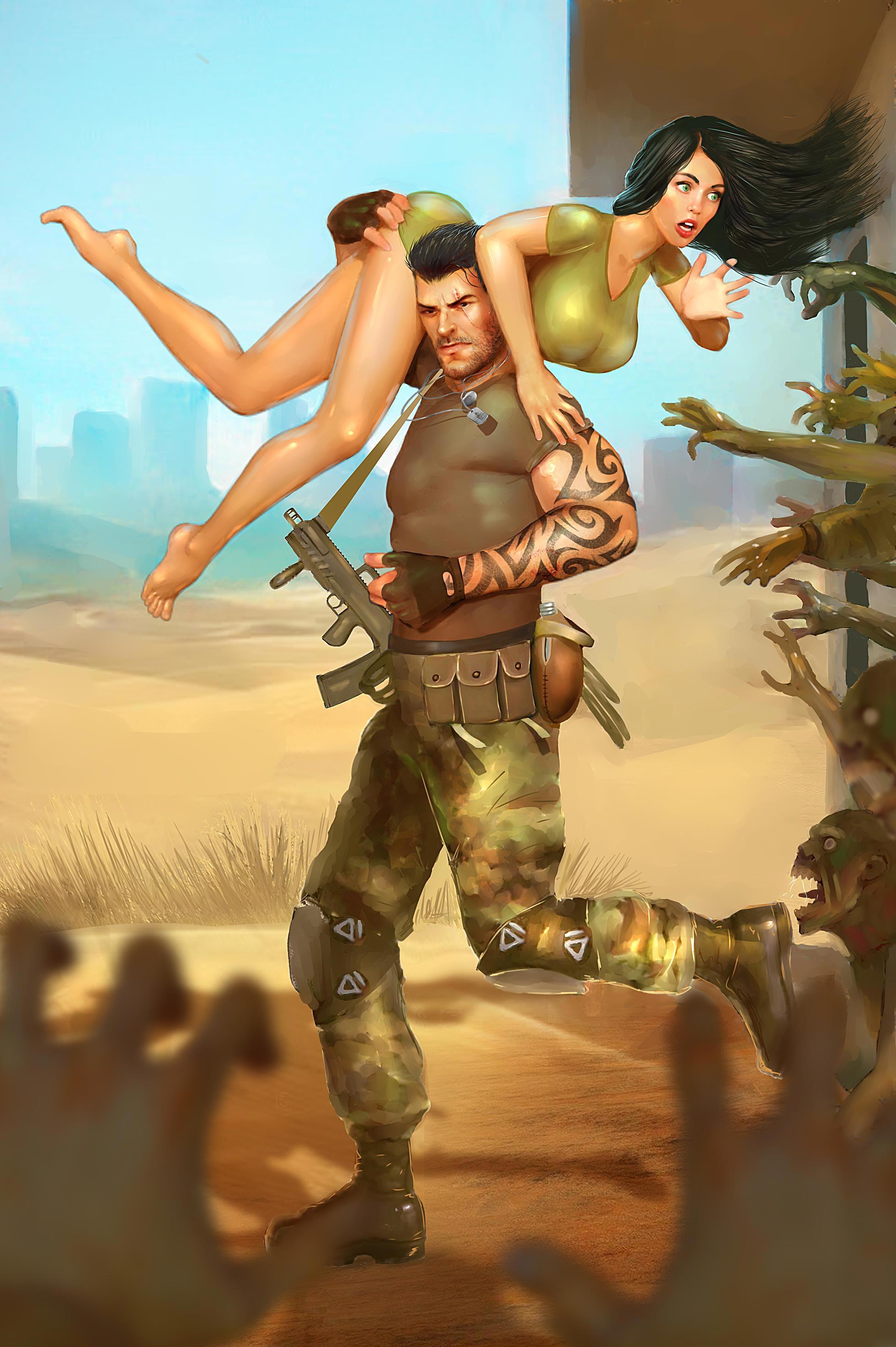 ТЗ Мужчина-наемник, морда кирпичом, темные волосы, шрам на глазу и щеке, татуировка закрывающая шрам от укуса зомби, армейский жетон и медальон, и еще кучка мелочей.