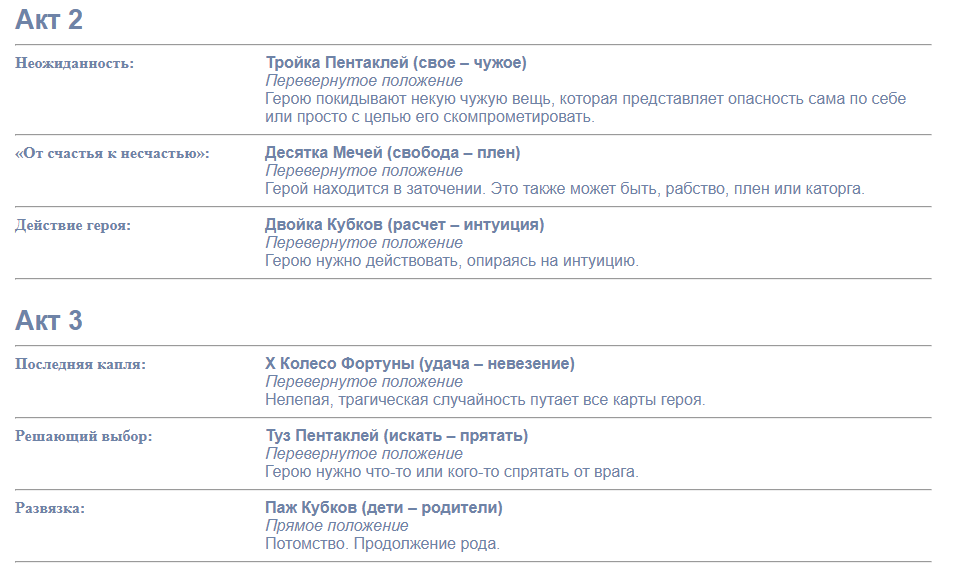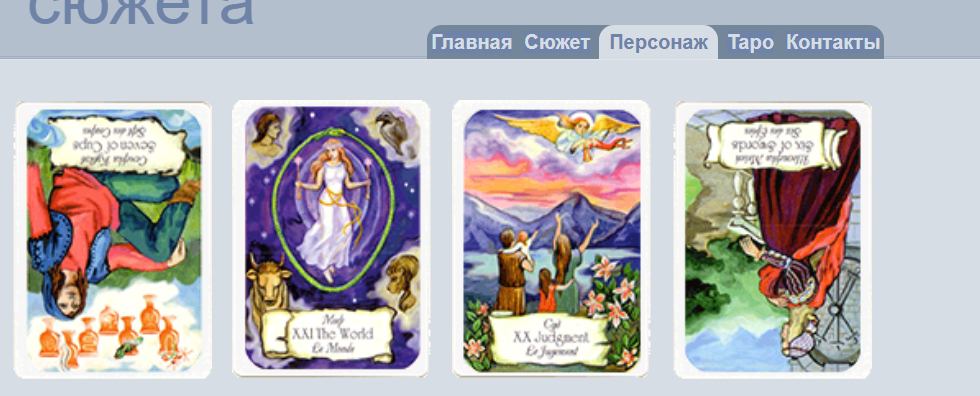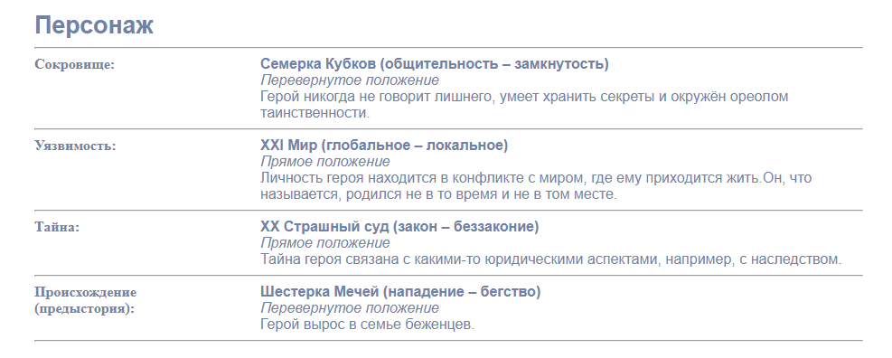 Простой, но интересный генератор сюжетов на основе карт Таро, довольно интересен. Расклад даёт основные пункты (разъяснения по пунктам есть там же), выглядит немного странно и иногда кажется чем-то бессвязным, потому как интерпретация идёт именно от значения самих карт, но можно выцепить и что-нибудь интересное.
