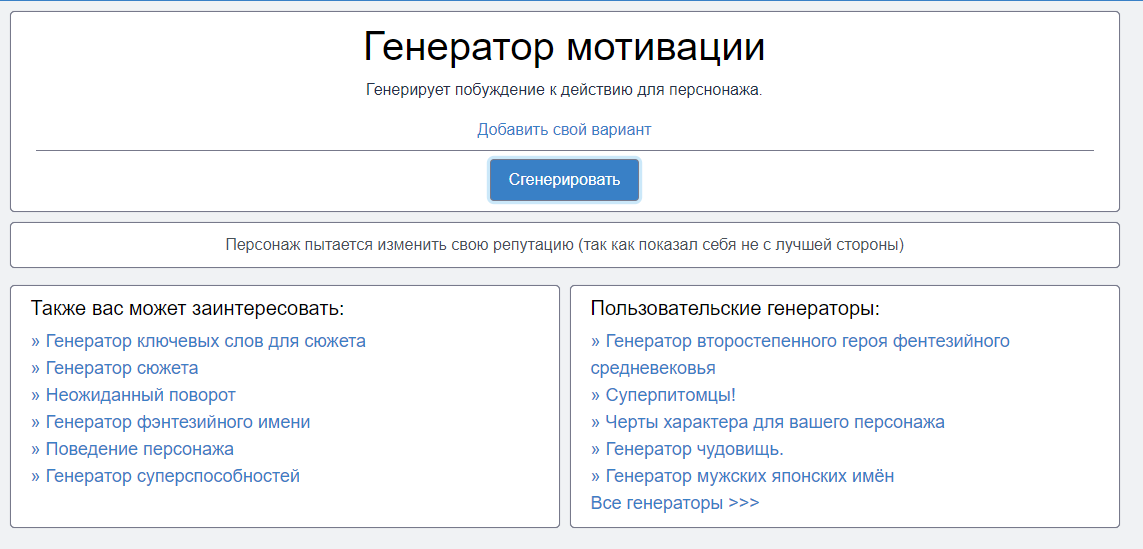 4). Генератор всякого-разного от персонажей до мотиваций.
