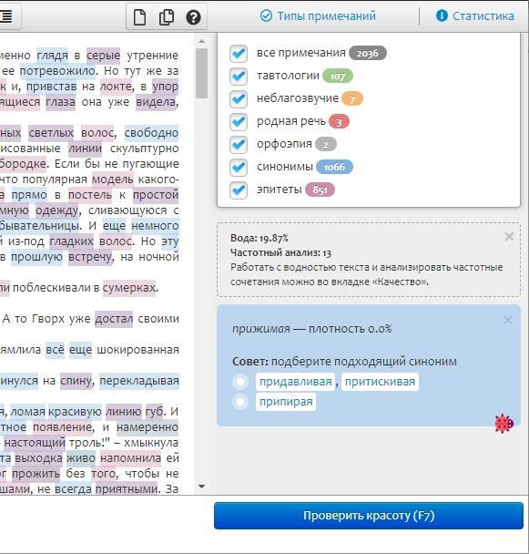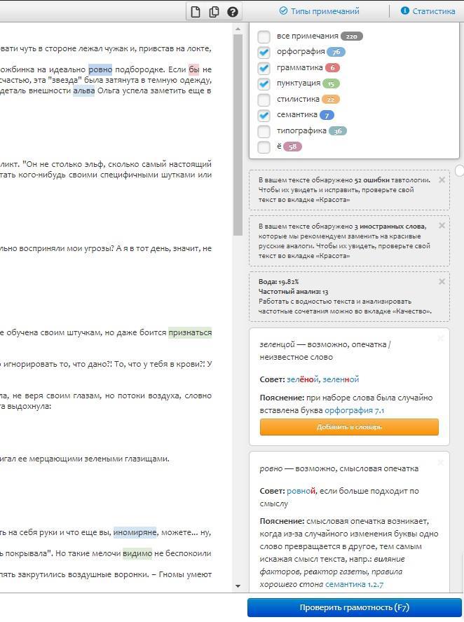 Конечно, это далеко не профессиональная вычитка текста, но многие некрасивости, шероховатости и просто невнимательные ошибки тут вычищаются. Поэтому очень рекомендую пользоваться данным сервисом сетевым авторам