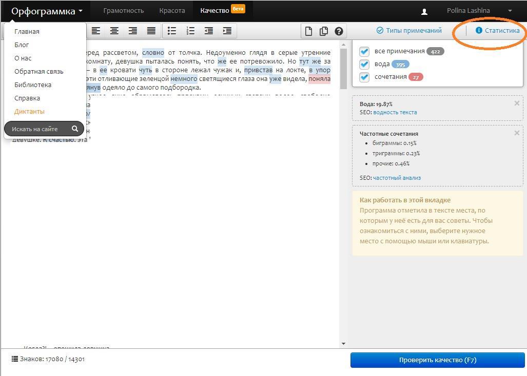 У Орфорграммки я использую только вкладки "Грамотность" и "Красота". На фото ниже что проверяется в "Качество", куда я не заглядываю обычно, потому что у меня не коммерческие и научные тексты, а художественные: