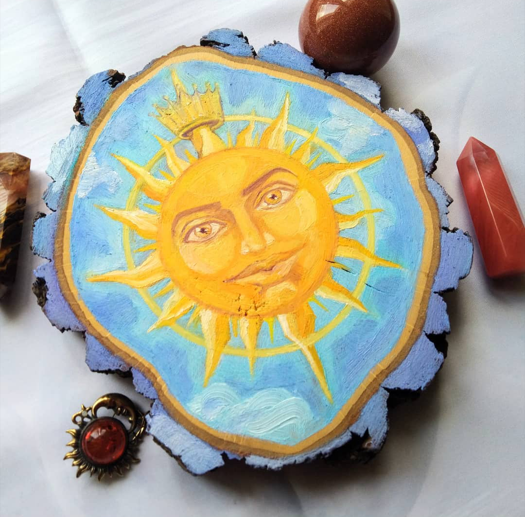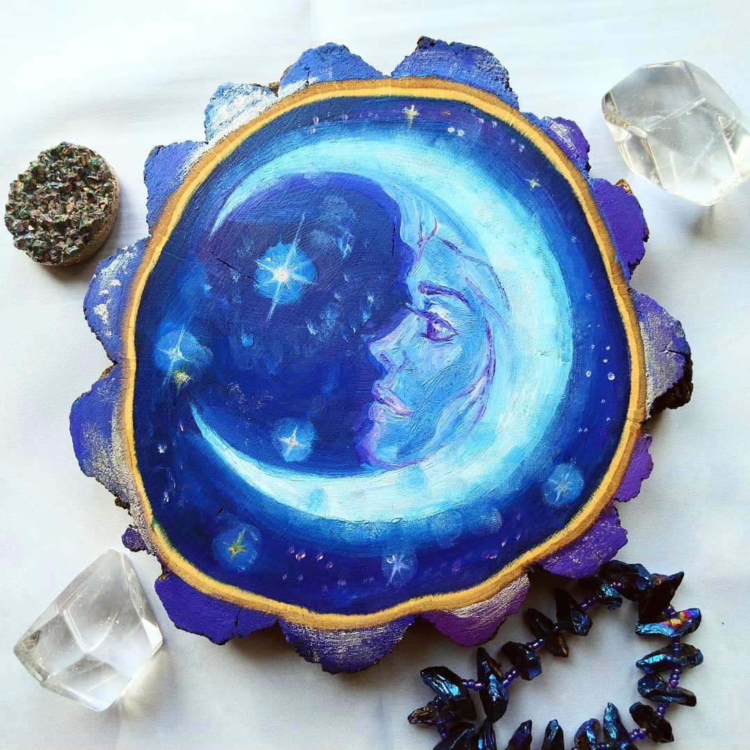 Дома около года без дела лежали несколько спилов дерева, которые покупались изначально как подставки под новогодние фигурки. В результате от нечего делать я расписала их маслом, и они стали украшением интерьера