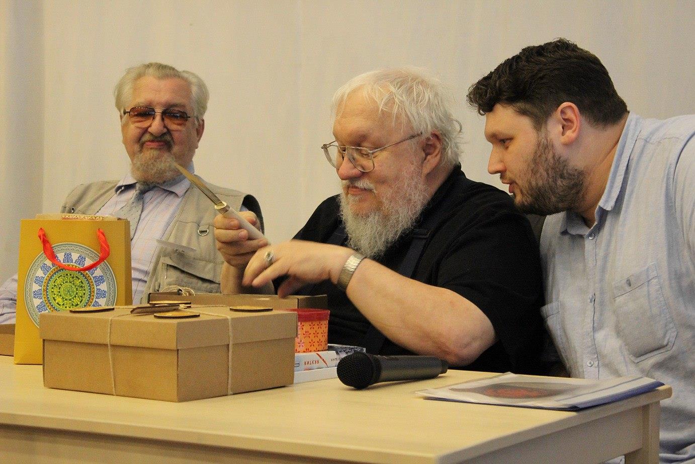 Разумеется, почетному гостю дарили всякие сувениры - и организаторы Фантассамблеи, и простые читатели. Но какая там была девочка из Якутии. Собственно, не одна, а с семьей (и даже младенцем). Девочка, конечно, заткнула всех за пояс в части подарков Мартину. Обалдел не только Мартин, но и все вокруг. Чего только она не привезла: серебряные изделия, лапу волка, путеводитель по Якутии, :) якутский нож с резной рукоятью и еще всякого.