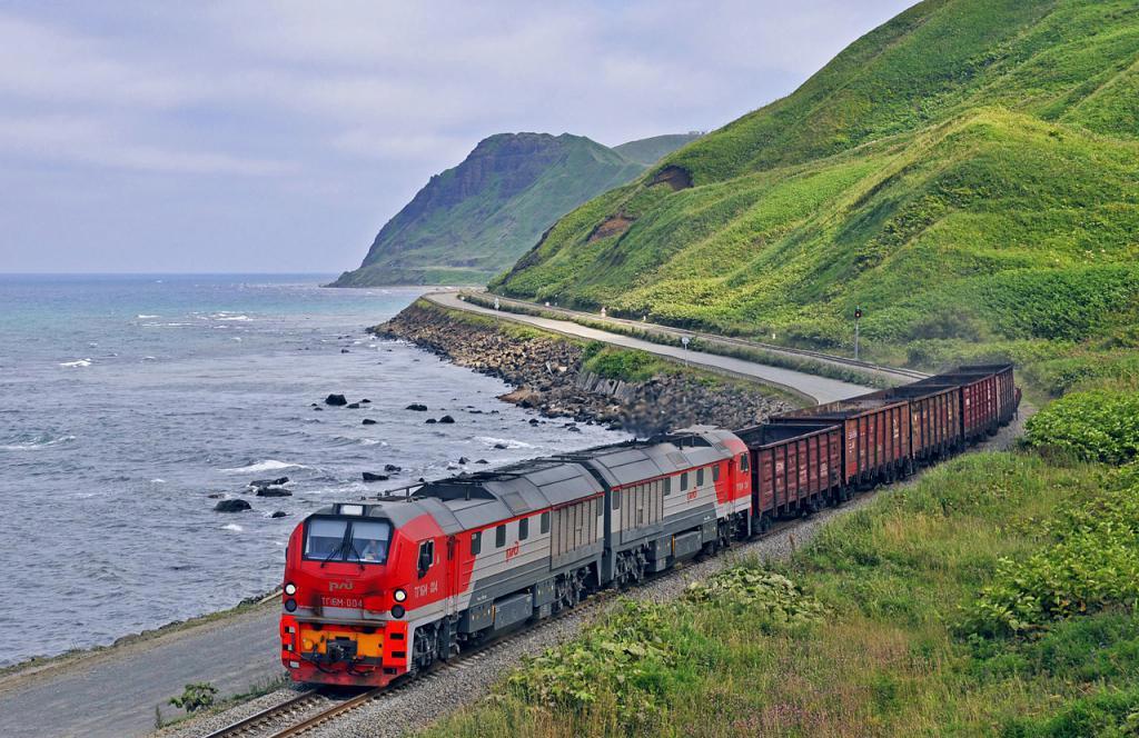 Как видите здесь довольно много участков, где путь проходит по самому краю острова, недалеко от моря. Где-то железнодорожные пути отделяет дорога, уже хорошая) по крайней мере до Охи, крупного города на севере Сахалина и конечной станции для пассажирского поезда. И тогда уже везёт автомобилистам любоваться видами) И когда я говорю, что железная дорога проходит недалеко от моря, то имею ввиду совсем близко