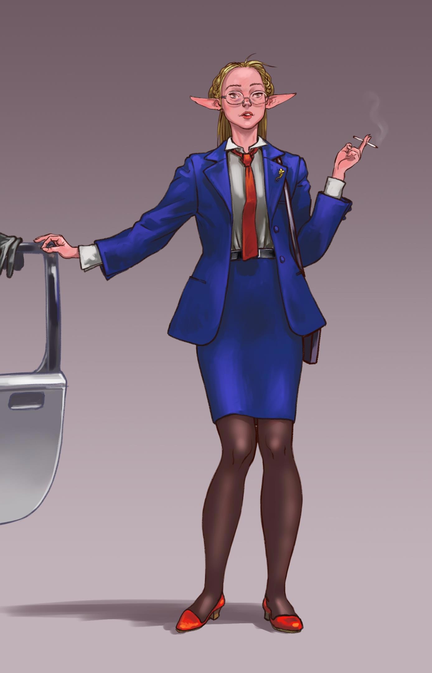 На портрете - частный детектив Вэлрия Анна Вэлтритдотир, официальный консультант королевской криминальной полиции города Одисйотль по специальным вопросам. На портрете ей около шестисот лет, что соответствует человеческим 50-55 (средняя продолжительность жизни эльфов - 800 лет), однако старение у эльфов внешне отражается не так, как у людей, потому это не бросается в глаза.