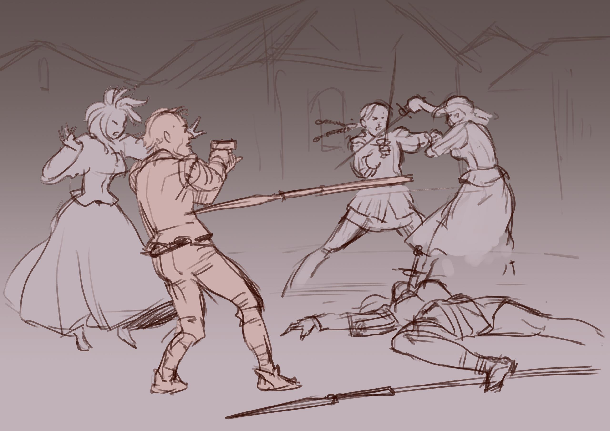 - Юрий! - закричала вдруг Катарина. Я быстро повернулся и в этот момент меня попал обломок пики. Дыхание выбило, но боли почему-то не было. От сильного броска я начал заваливаться на спину, видя, как рыжая проскальзывает прямо под клинком Катарины и бежит к вставшей на ноги здоровячке. Упав на брусчатку, я всё же выстелил. И кажется, даже разок попал, хотя это маловероятно. Но рыжая захромала и охрипшей разбойнице пришлось подхватить Волчью Дозорную, чтоб та не упала.