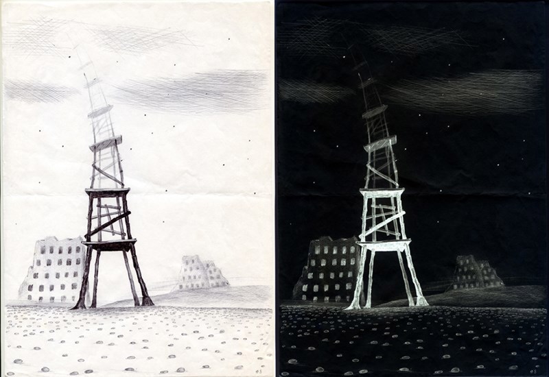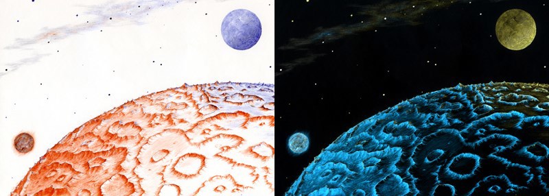 Тени в инверсии будут светиться, это надо учитывать при рисовании лиц. А звёзды надо располагать не как обойные гвозди на двери, а в лирическом беспорядке, чтобы небо было похоже на настоящее. Звёзды рисуют чёрной, синей и оранжевой ручкой. Они должны быть разного размера, но не слишком мелкие, а то при сжатии они станут серыми и почти невидимыми. А ещё дело в пропорциях. Белого, который в итоге станет чёрным, должно быть реально больше, чем цветного, иначе получится не то. Иногда инверсия способна превратить захудалый рисунок в нечто таинственное.
