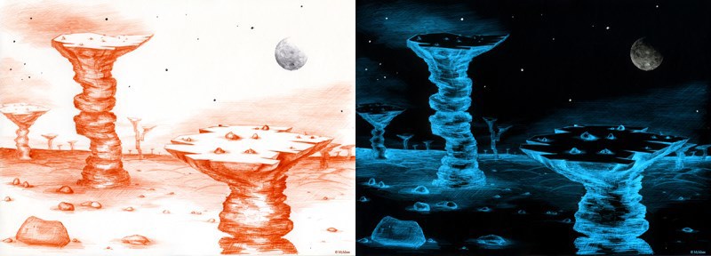 Штриховка крестиком — дело хорошее, но можно рисовать параллельные волосные линии, меняя силу нажима, и добиваться интересных эффектов. Бумагу нужно брать слоем в несколько листов — по жёсткому шариковый стержень рисует плохо. При рисовании речных волн нужно быстро водить ручкой туда-сюда, словно вытирая стержень о бумагу. Планеты рисуют, обводя монеты. Если хочется нарисовать скалу, нужно представить себе, что это развалившийся обломок древесного пня — и получится реалистичнее. Почему бы не рисовать сразу на чёрном фоне? Не то получается. Когда рисуешь одно, а после инверсии получаешь другое, присутствует некая тайна. Поэтому инверсионизм — магический стиль. Только никому не рассказывайте!