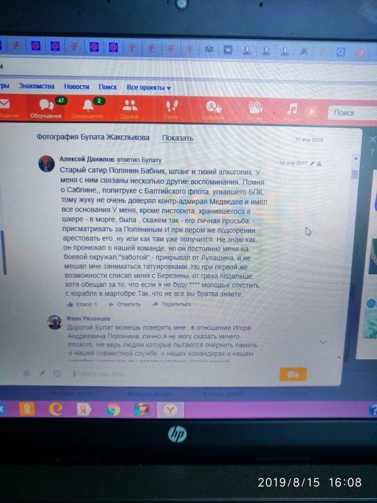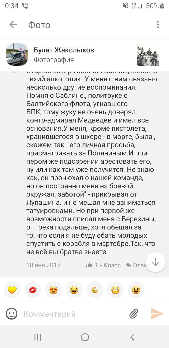 Старый сатир Полянин. Бабник, шланг и тихий алкоголик. У меня с ним связаны несколько другие воспоминания. Помня о Саблине ,,политруке с Балтийского Флота, угнавшего БПК, тому жуку не очень доверял контр-адмирал Медведев и имел все основания. У меня, кроме пистолета хранившегося в шхере – в морге, была, скажем так – его личная просьба, - присматривать за Поляниным. И при первом же подозрении арестовать его, ну или как там уже получится». Конец цитаты. (Орфография сохранена. Слова и предложения не изменены. Фото и скан данного ответа имеются.)