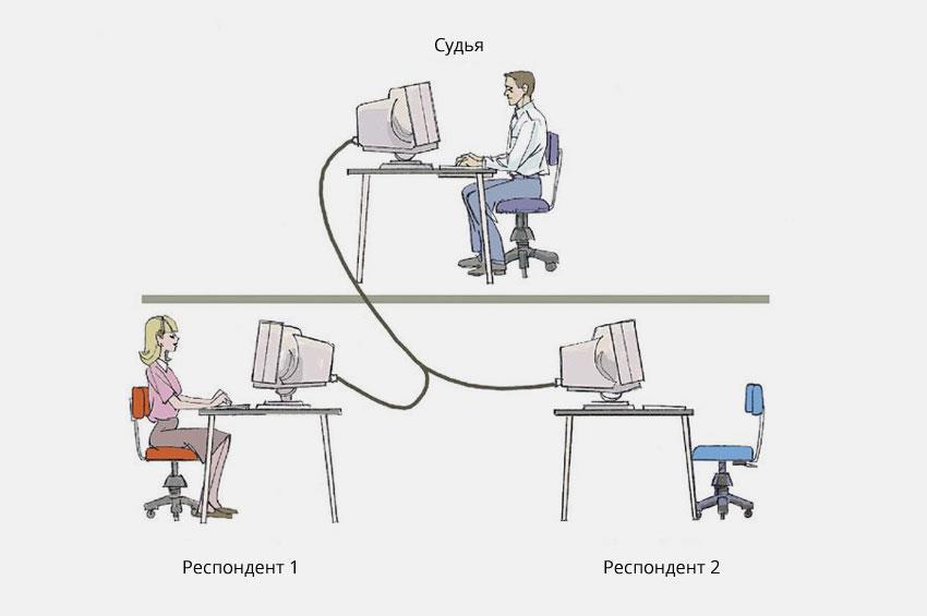Идея была предложена Аланом Тьюрингом в 1950 году. В стандартном тесте-игре участвуют трое: игрок А — компьютер, игрок В — человек и игрок С – ведущий. Игрок С общается с двумя другими письменно и не видит своих собеседников. Задачей ведущего является определить, кто из них компьютер, а кто — человек. Задача компьютерной программы — ввести человека в заблуждение, заставив сделать неверный выбор.