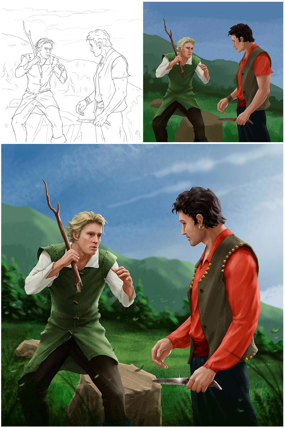 Автор: Салихов ВасильНу повздорили немного парни, бывает, главное, что все живы остались.) На мой взгляд, получилась очень яркая и напряженная сцена из книги Елены Абрамовой"Тень над Россаной. Зов Пути". Ниже представлена короткая хронология создания: