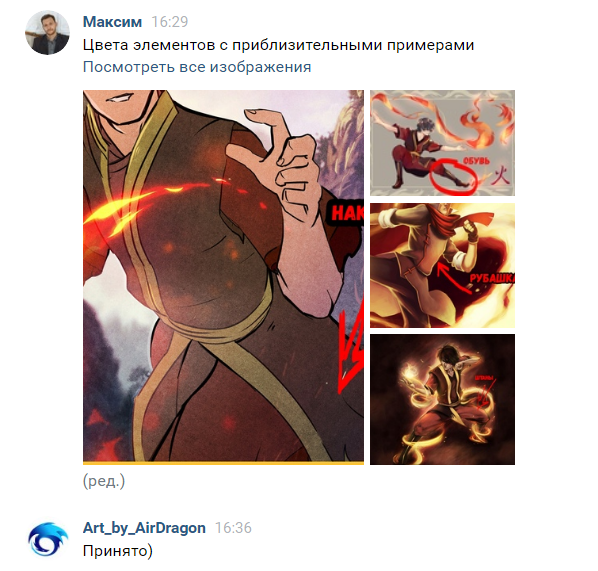 На данном этапе я хочу заметить, что меня очень порадовала манера общения художника. Приятно слышать на свои пожелания фразы: "Конечно)", "А, хорошо)", "Принято.", "Хорошо)) Сделаю правки и снова пришлю.", "Хорошо) Залайню, нанесу базовые цвета и пришлю удостовериться, что по цветам все верно)", "Принято), Хорошо, поправлю)", и другие в подобном стиле.