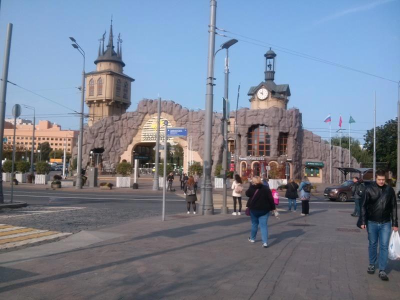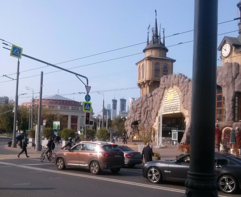А это я попытался поймать в кадр забавное. Вот слева здание метро Краснопресненская. Подумать только, где сейчас зоопарк в 1905 году люди на баррикадах умирали, и сыпали снаряды царских гаубиц, стрелявших просто по кварталам. Справа собственно уже знакомый нам вход в зоопарк с его сказочными башнями. А вот по центру - видите? Это там вдалеке небоскрёбы Москва-сити. Такое вот забавное совпадение, современные башни в одном кадре со сказочной.