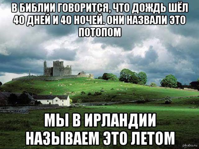 Что такое Ирландия? Она спрятана между зелёной кружкой Гиннеса и рыжими волосами разделённых хмельной пеной. Ты не поймёшь колорита, пока на твоём лице не появятся пивные усы, а запястья не скуют ирландские наручники. Не забывай быть ирландцем и поступать так же как три кружки назад. Однако, давайте пройдёмся по Guinness. Слава Святому Патрику, что «догоняться» до состояния «лепрекона» и мешать другим, тут запрещено законом, кроме одного дня в году(думаю вы догадались какого). К слову, о самих лепреконах, зелёные ребята изначально обладали нормальным ростом. Проделки англичан? Да, но это не точно. Хотя многие грехи здесь списывают именно на них. Что и говорить, если ирландцы на сто процентов уверены в их, в их с феями существовании? Да, чёрт возьми, они сами не лучше их. Оставили огромное количество разрушенных замков и руин по всей Айре, а «Sean's bar» открытый в 900-ые годы нашей эры стоит целёхоньким до сих пор и считается старейшим в Европе. Почему упомянул нашей эры? Я бы не удивился открытию и до нашей эры, поскольку самые ранние свидетельства присутствия человека на этом острове датируются 12500 годом до н.э. Идём дальше, рыжих на этом острове 10%, но безумцев тут и так хватает, впрочем, как и во всём мире. Шутка ли, но в Ирландии проживает в 17 раз меньше её граждан, чем на самом острове.