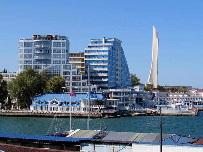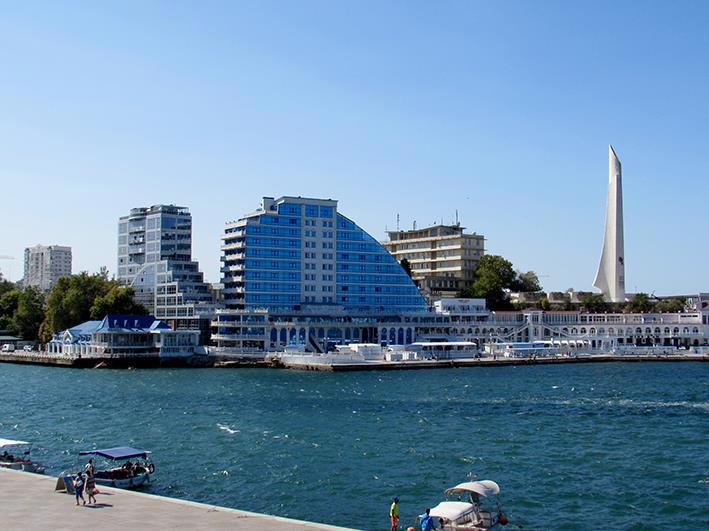Голубая "горка"- гостиница наводел. Она нависает над пляжем "Хрустальным" (или по местному- "Хрусталка"), За ней- Институт Биологии южных морей, и Штык и парус.