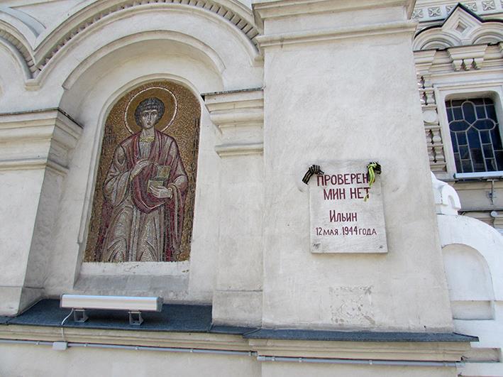 На стенке собора- была надпись- "проверено- мин нет" и роспись сапёра с датой проверки.