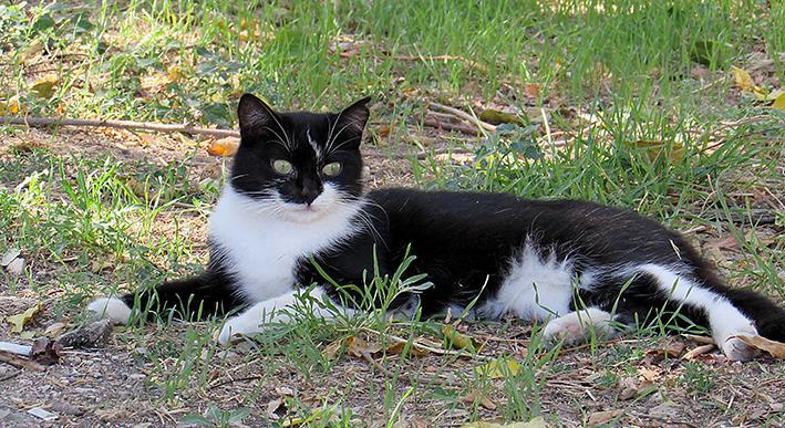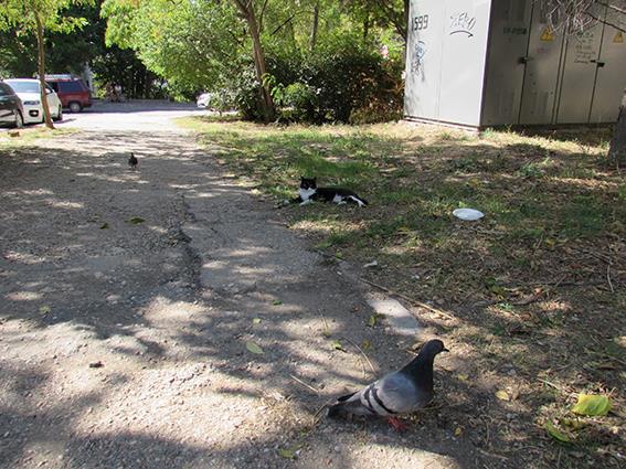 Одного такого поймал в объектив- лежал в теньке и лениво наблюдал за голубями.С погодой повезло- очень солнечно и жарко. Пока взобрался на холм- вспотел как летом- пришлось умываться водой (постоянно таскал с собой и пил). От такого марша на жаре и и подъёма на холм- устал.