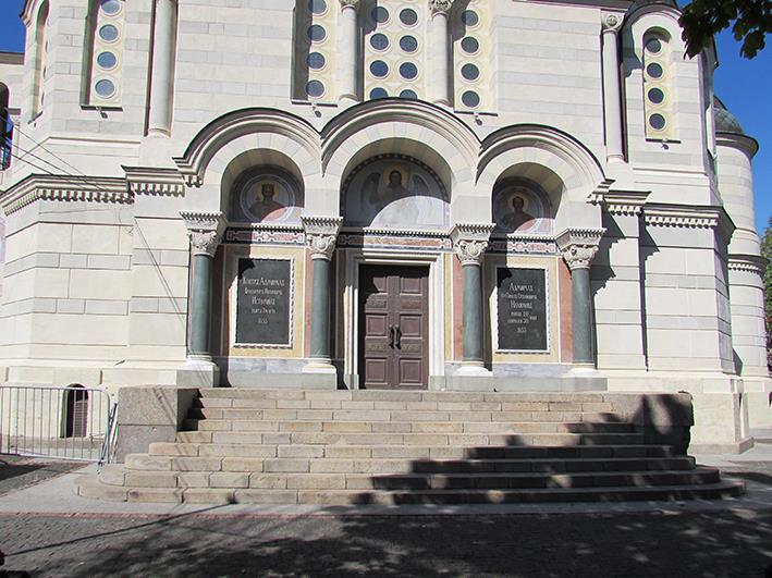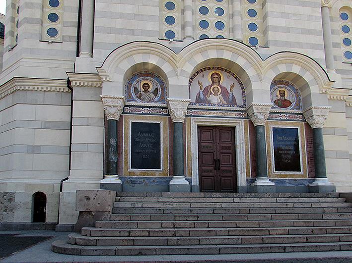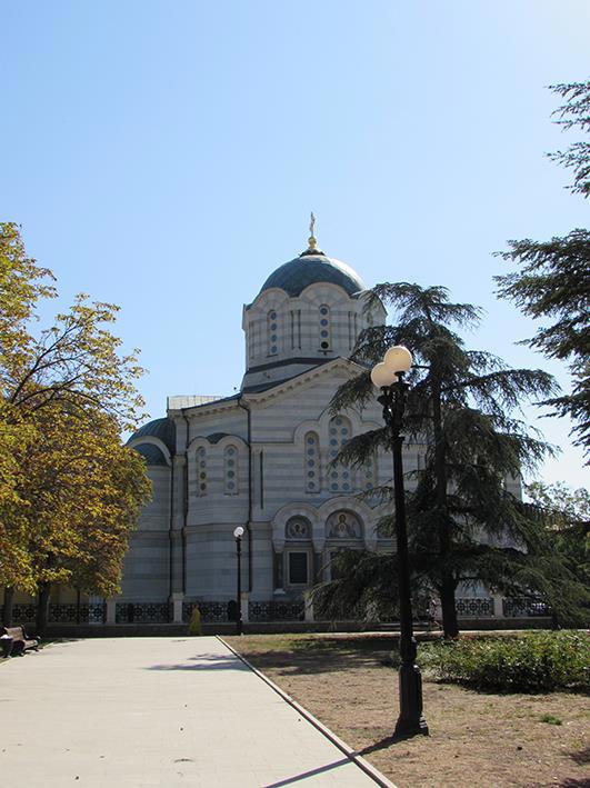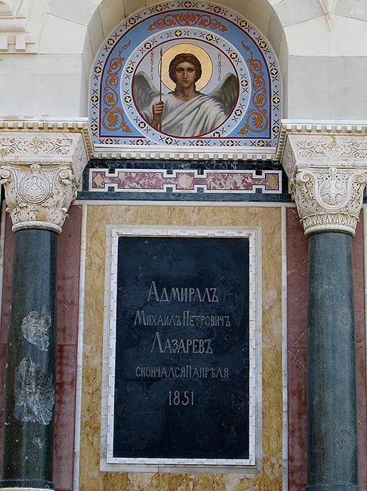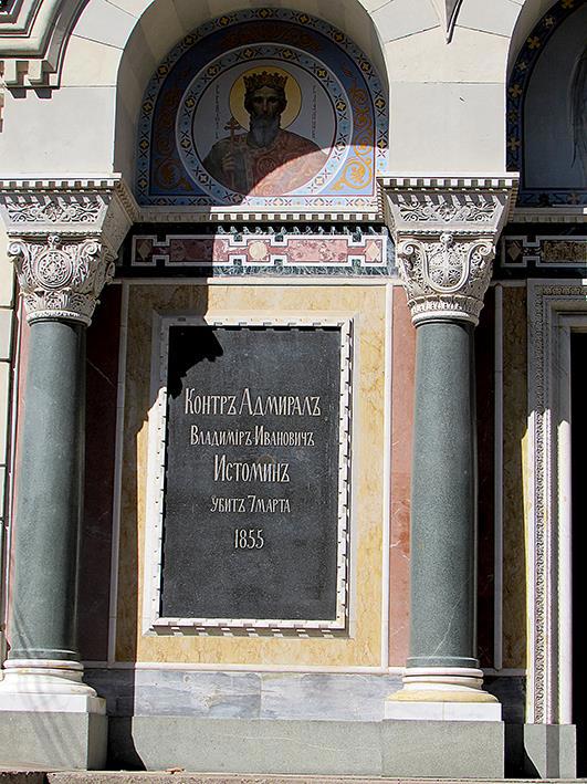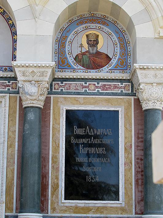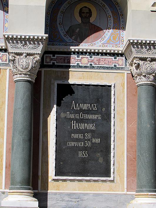 С права и слева от входа, на торце здания- есть доски с именами Адмиралов посвятивших свою жизнь городу и флоту, а так же павших при обороне города в русско-турецкой войне 1853-1855 годах.