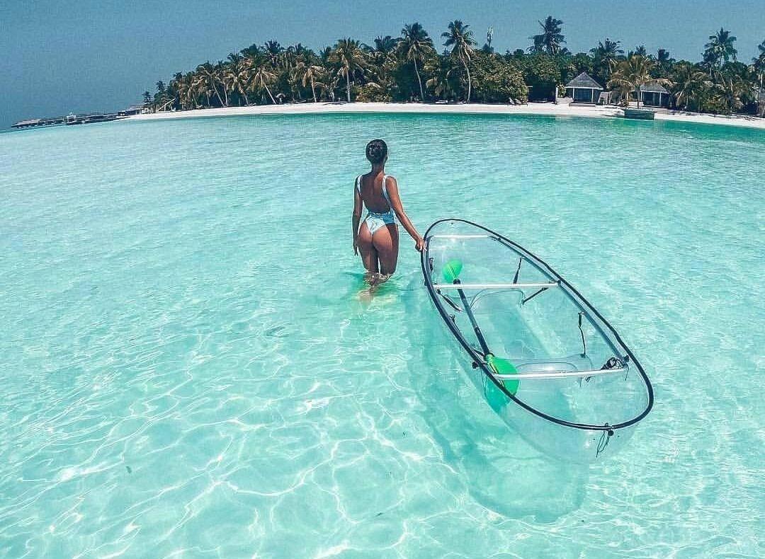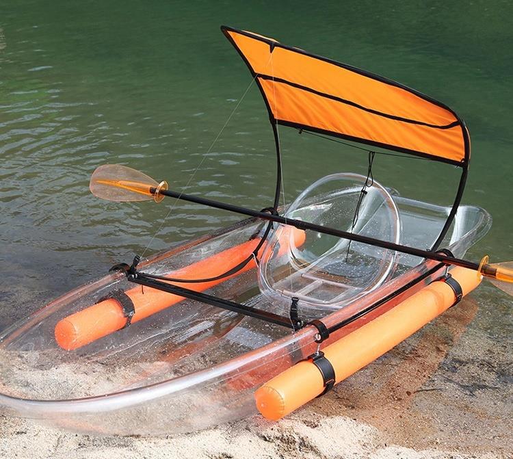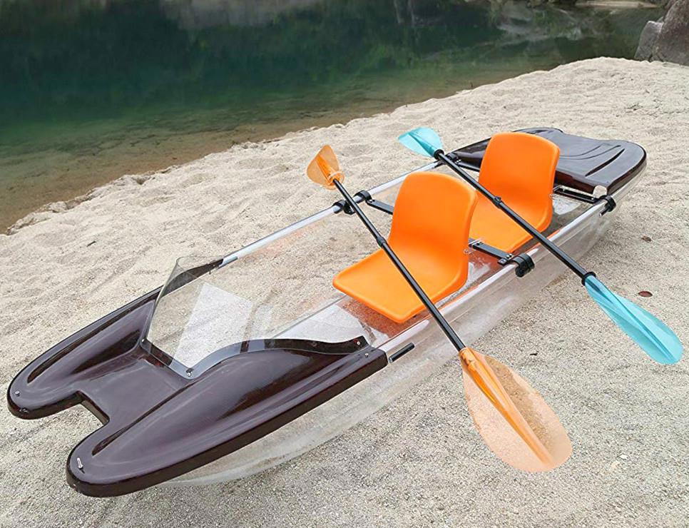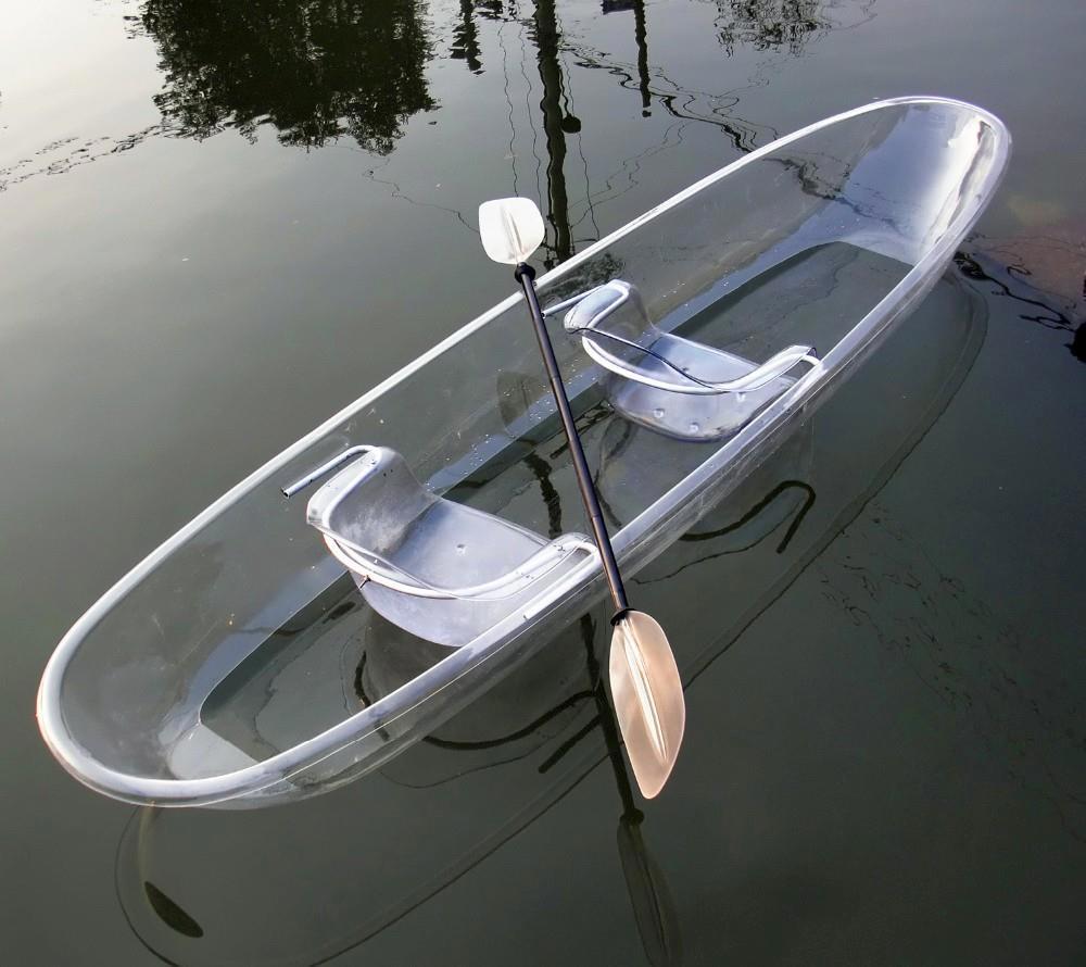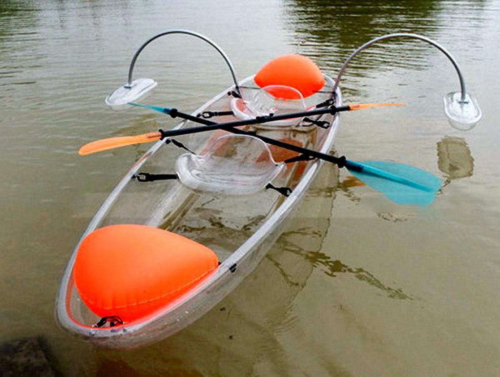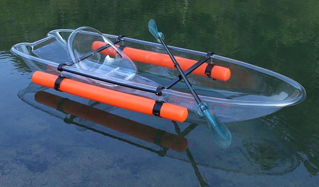 Самыми понятными из прозрачных вещей можно, наверное, считать китайские маленькие лодочки из поликарбоната. Не они были первыми, разумеется, но по количеству им сейчас равных нет. Причём производители стараются изо всех сил и лодки у них немного разные. Хотят удовлетворить в этом углу разным потребностям. Вот простейшая двухместная модель (есть такая же одноместная):